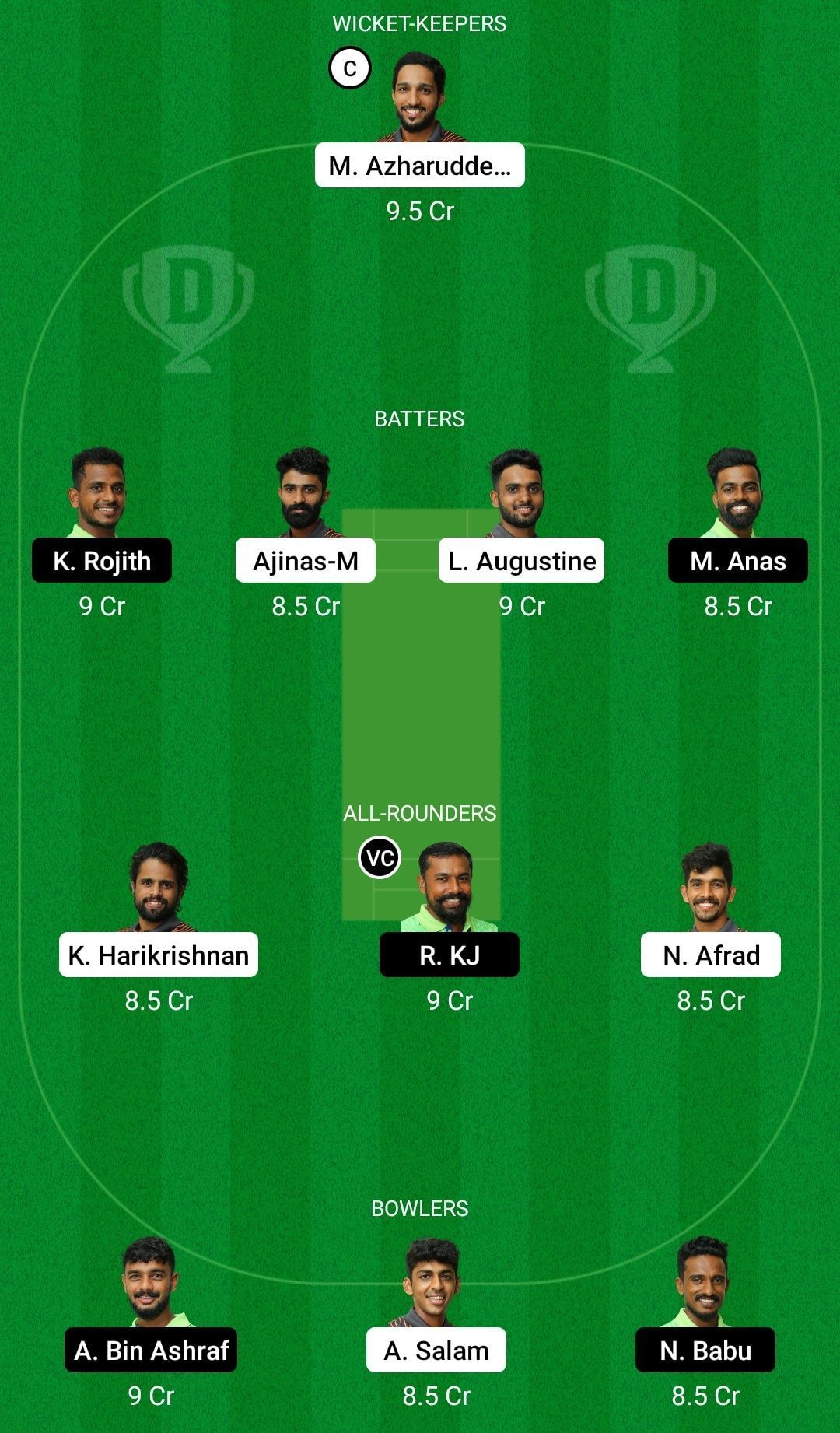 Captain: Mohammed Azharuddeen. Vice-captain: Rakesh KJ.