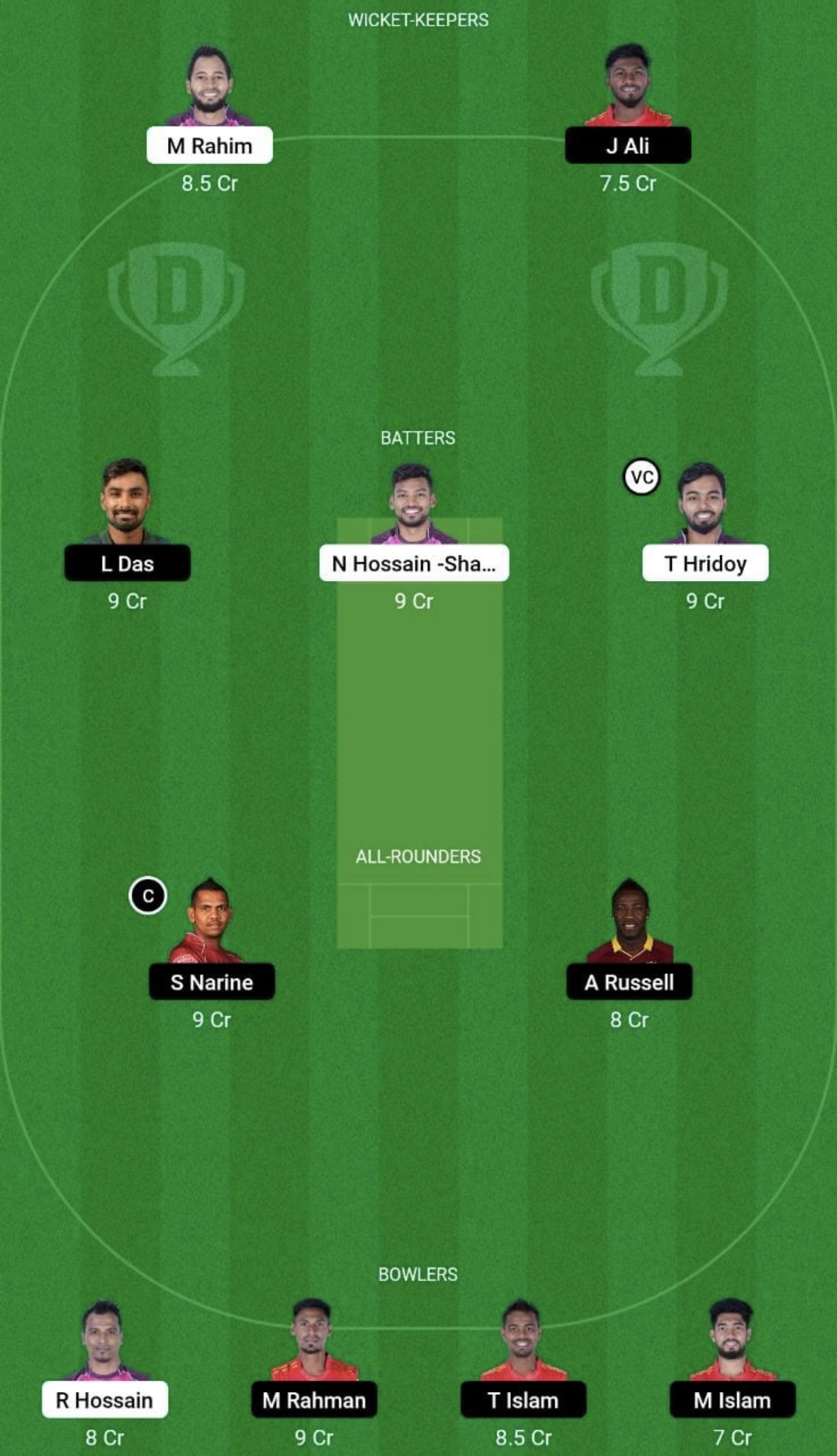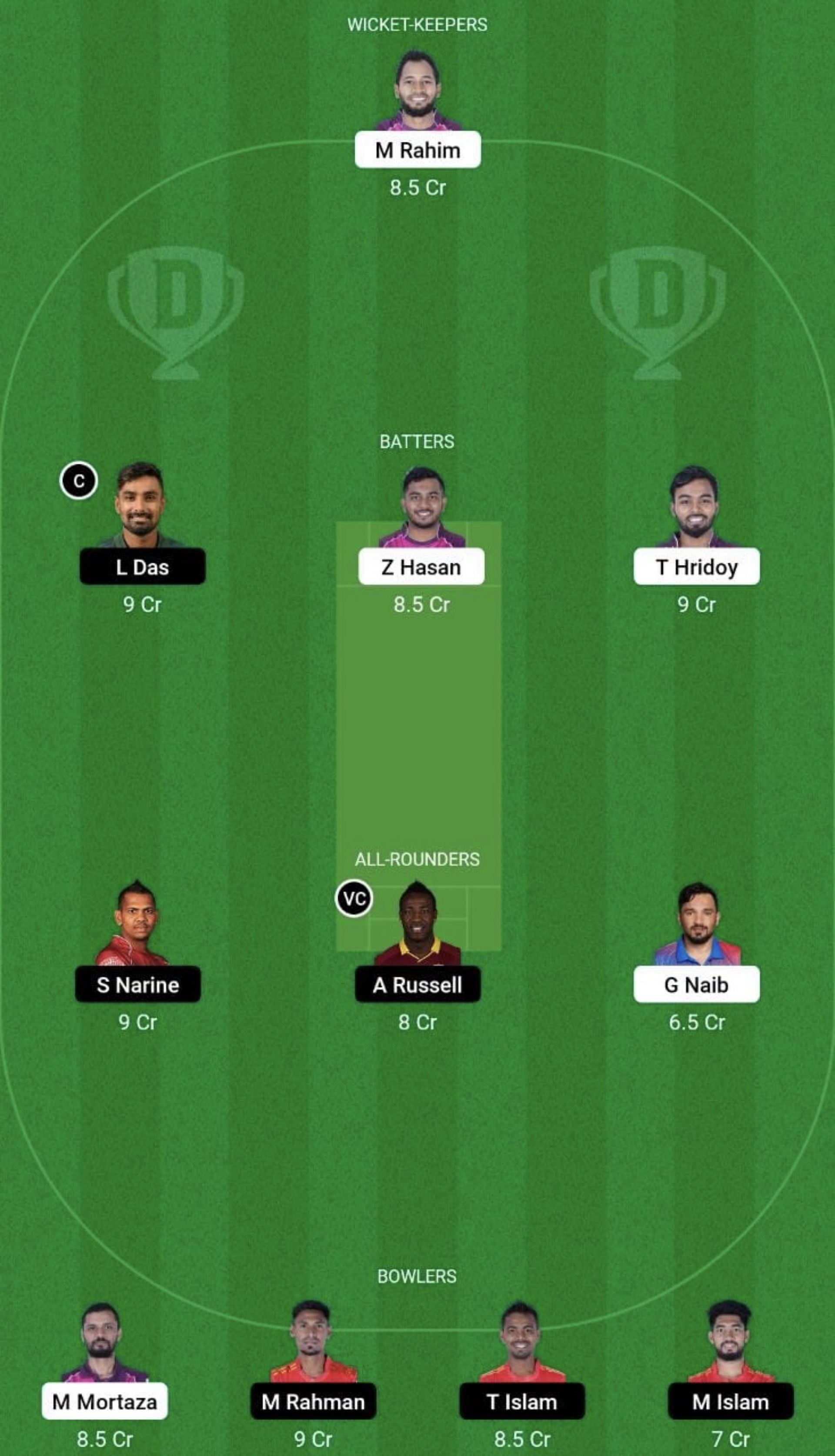 Moeen Ali, Litton Das (wk), Sunil Narine, Imrul Kayes (c), Jaker Ali, Johnson Charles, Andre Russell, Mosaddek Hossain, Mukidul Islam, Tanvir Islam and Mustafizur Rahman.