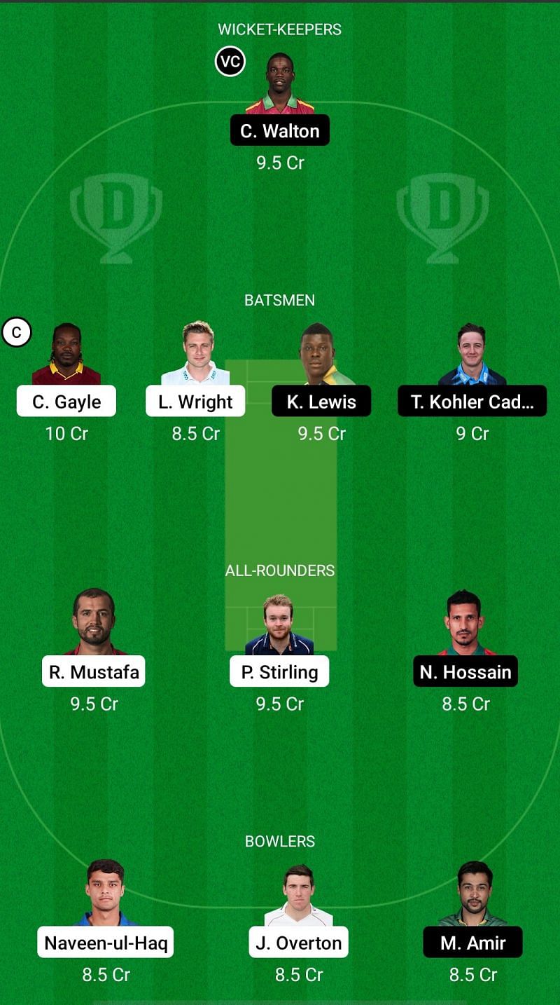 Fantasy Suggestion #1: Chadwick Walton, Chris Gayle, Luke Wright, Kenar Lewis, Tom Kohler Cadmore, Rohan Mustafa, Paul Stirling, Nasir Hossain, Naveen-ul-Haq, Jamie Overton, Mohammad Amir.