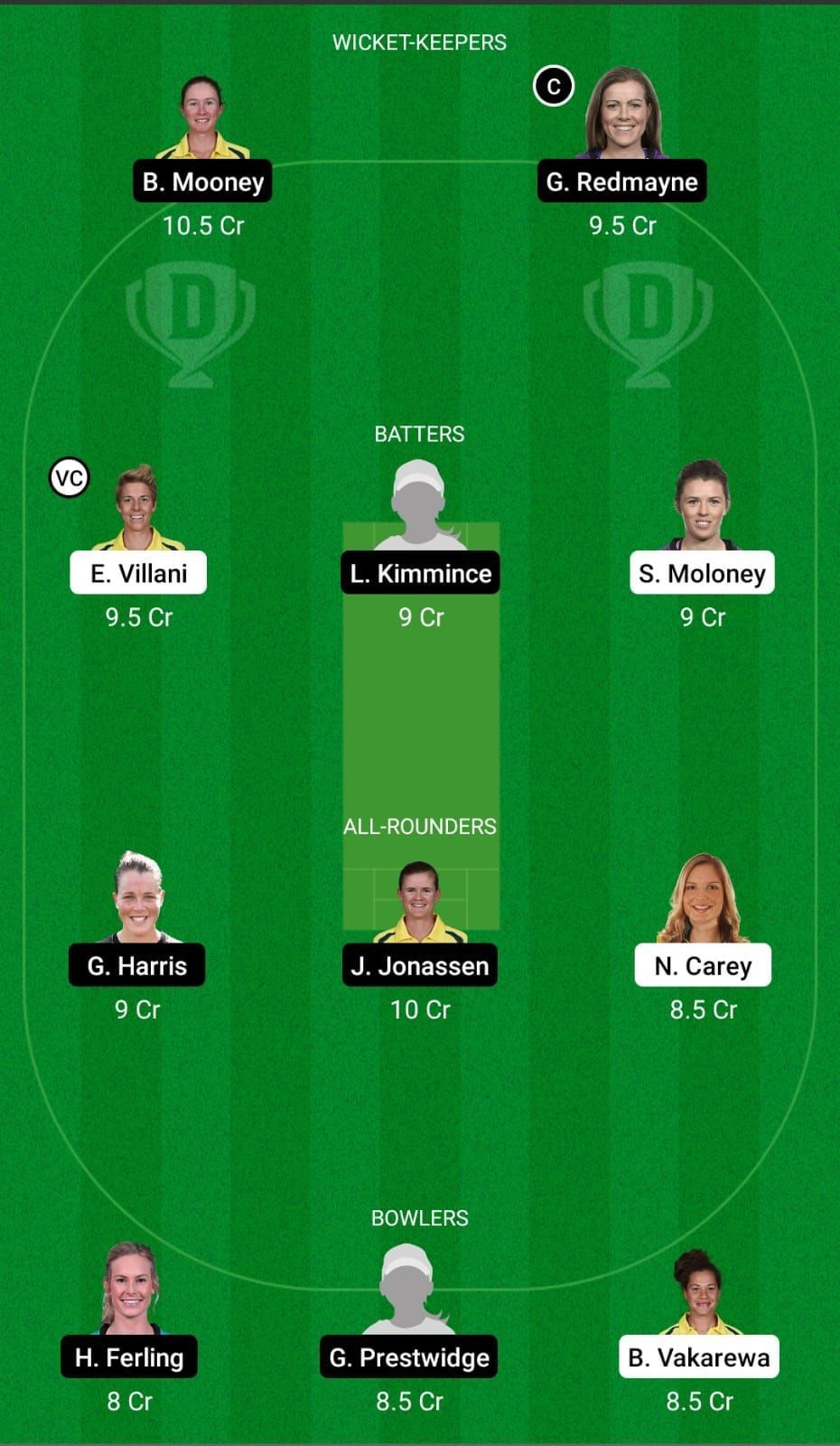 Fantasy Suggestion #1: Georgia Redmayne, Elysse Villani, Laura Kimmince, Jess Jonassen, Nicola Carey, Georgia Prestwidge, Belinda Vakarewa, Sasha Moloney, Grace Harris, Holly Ferling, Beth Mooney