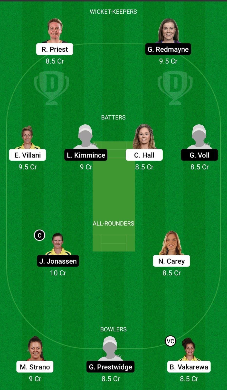 Fantasy Suggestion #2: Georgia Redmayne, Elysse Villani, Laura Kimmince, Jess Jonassen, Nicola Carey, Georgia Prestwidge, Belinda Vakarewa, Rachael Priest, Corinne Hall, Georgia Voll, Molly Strano