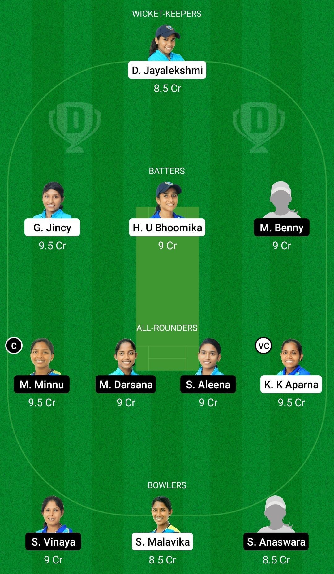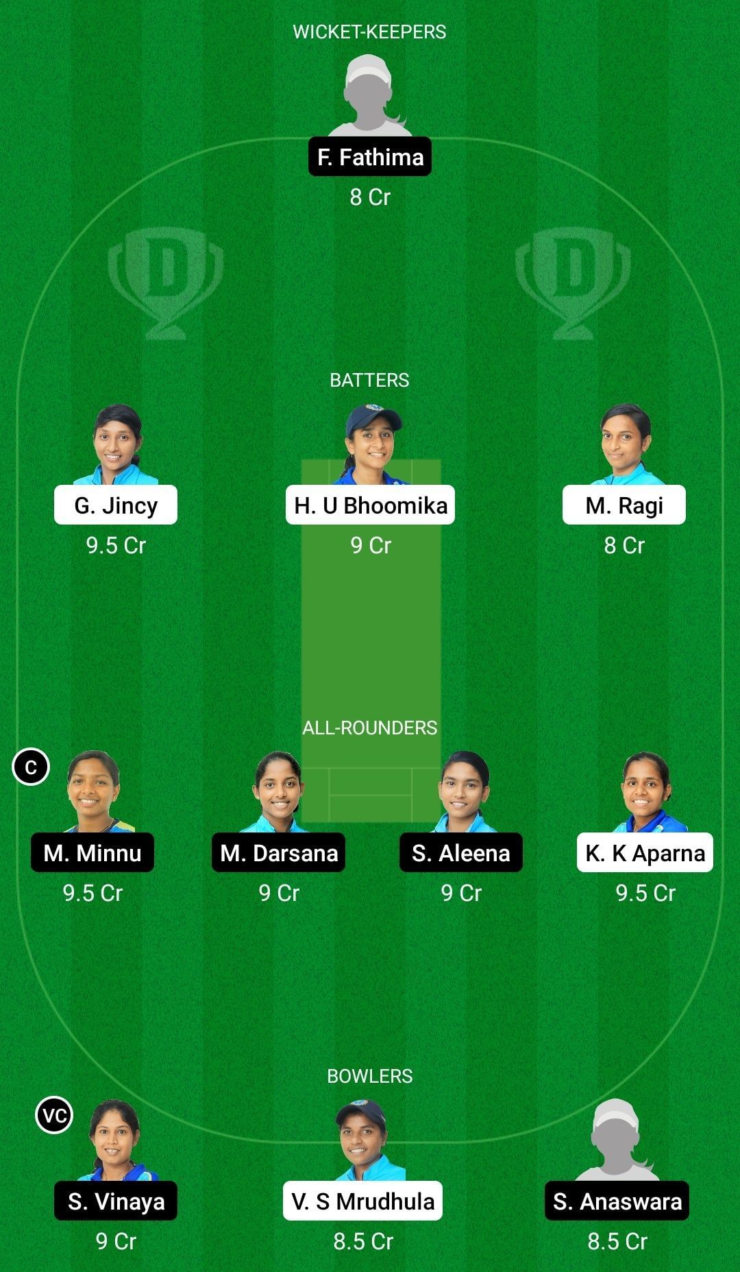 Fantasy Suggestion #2: Fairooz Fathima, Jincy George, H U Bhoomika, Ragi Mohan, Mani Minnu, Darsana Mohanan, Aleena Surendran, K K Aparna, Vinaya Surendran, Mrudhula V S, Anaswara Santosh