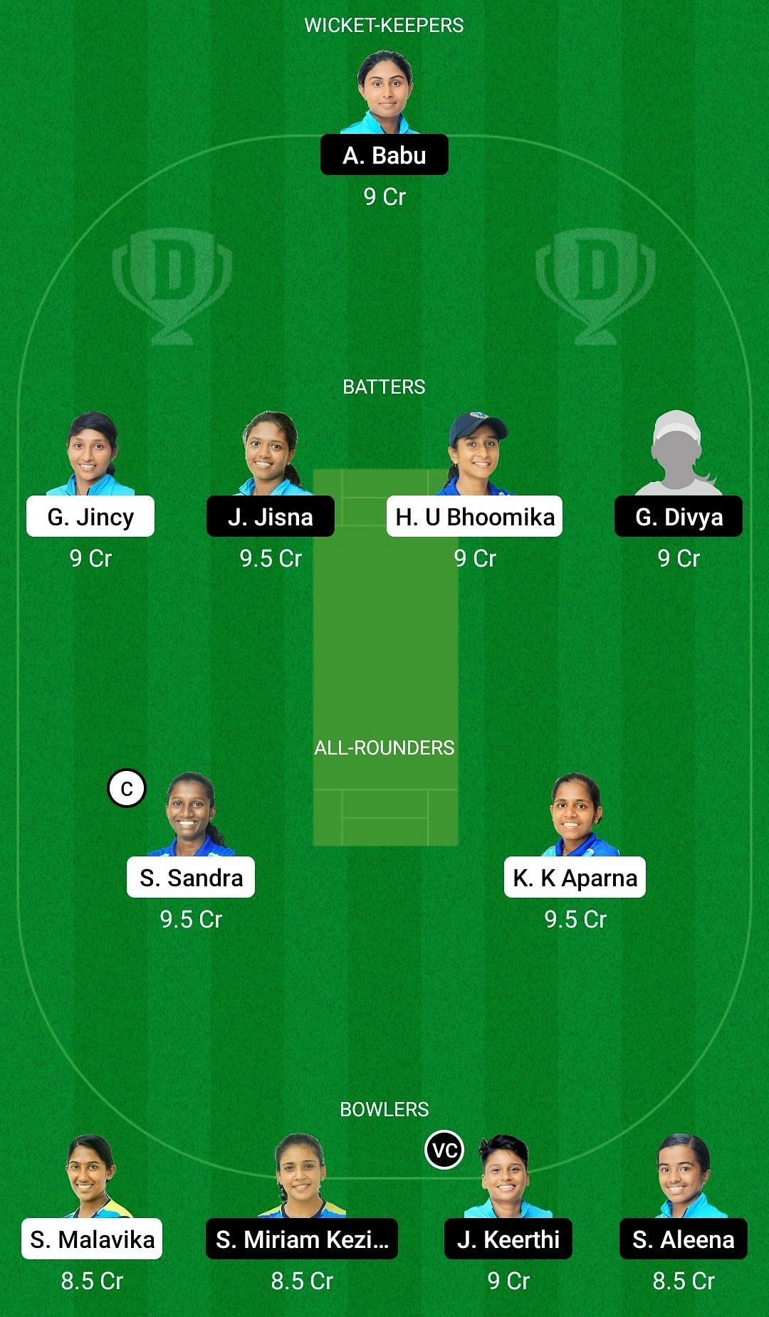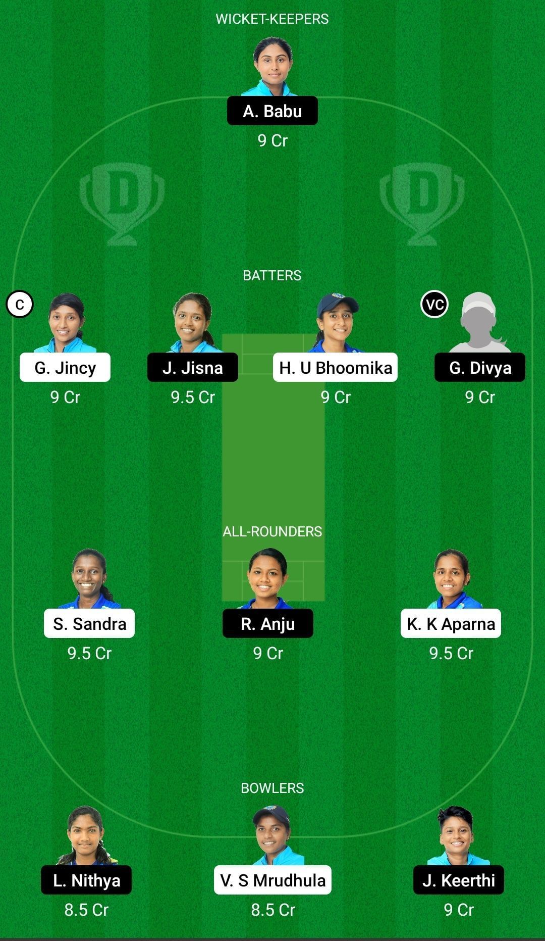 Fantasy Suggestion #1: Aswathy Babu, George Jincy, Joseph Jisna, H U Bhoomika, Ganesh Divya, Suren Sandra, K K Aparna, Sabu Malavika, Sabin Miriam Keziah, James Keerthi, Aleena Shibu
