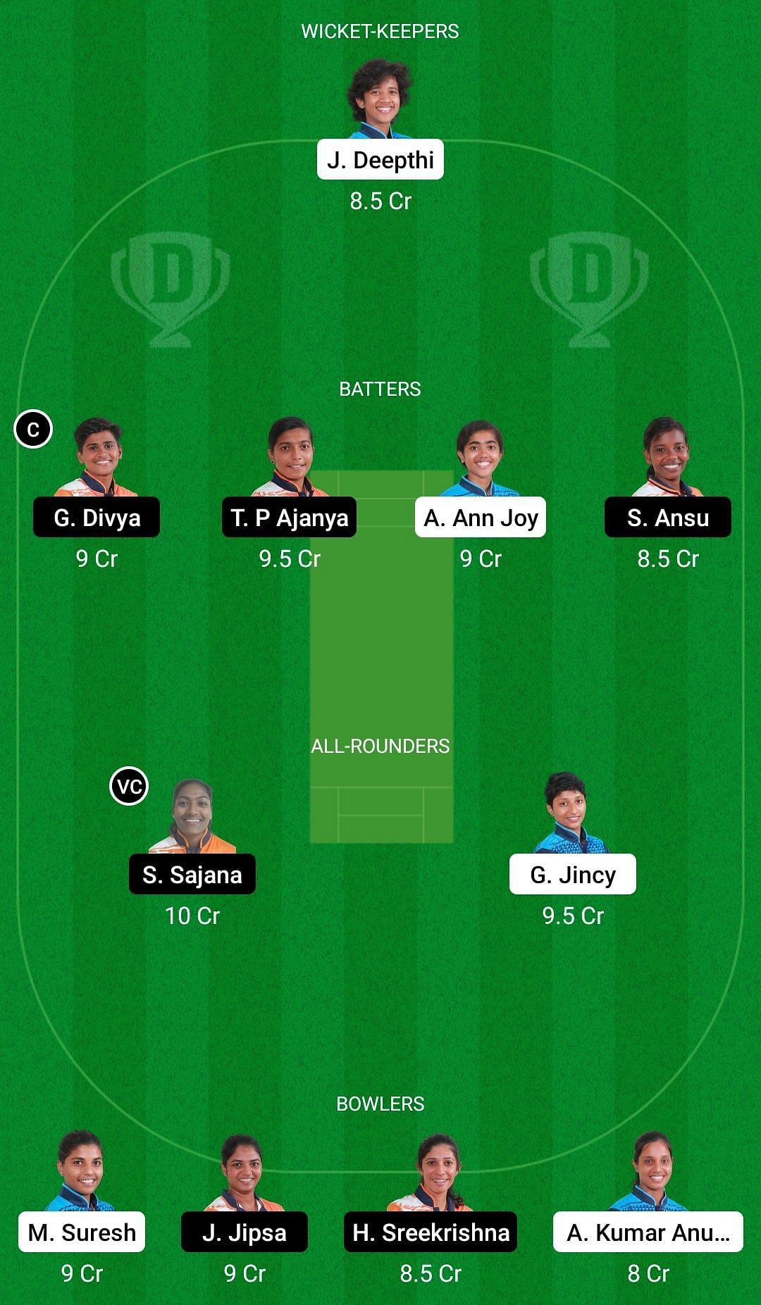Team Sapphire Probable Playing XI: JS Deepthi (wk), Ananya Pradeep, Aleena Ann Joy, Akhila Ponnukuttan, Sandra Suren, Jincy George (c), Mrudhula Suresh, Renjusha, Potti Manasvi, Yadhu Priya, Anusree Anil Kumar.