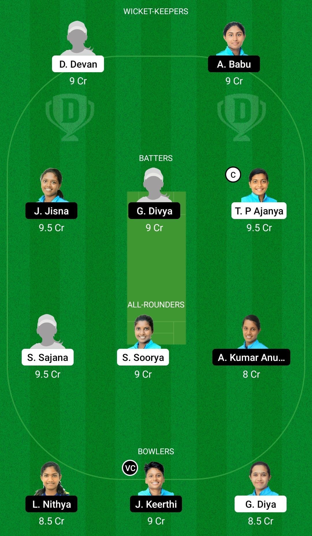Team Pearl: Aswathy Babu (wk), Jisna Joseph, Ganesh Divya, Akhila Ponnukuttan, Anju Rajan-I, TP Sruthi, Anusree Anil Kumar, Keerthi James, Sabin Miriam Keziah, Loordh Nithya, Aleena Shibu