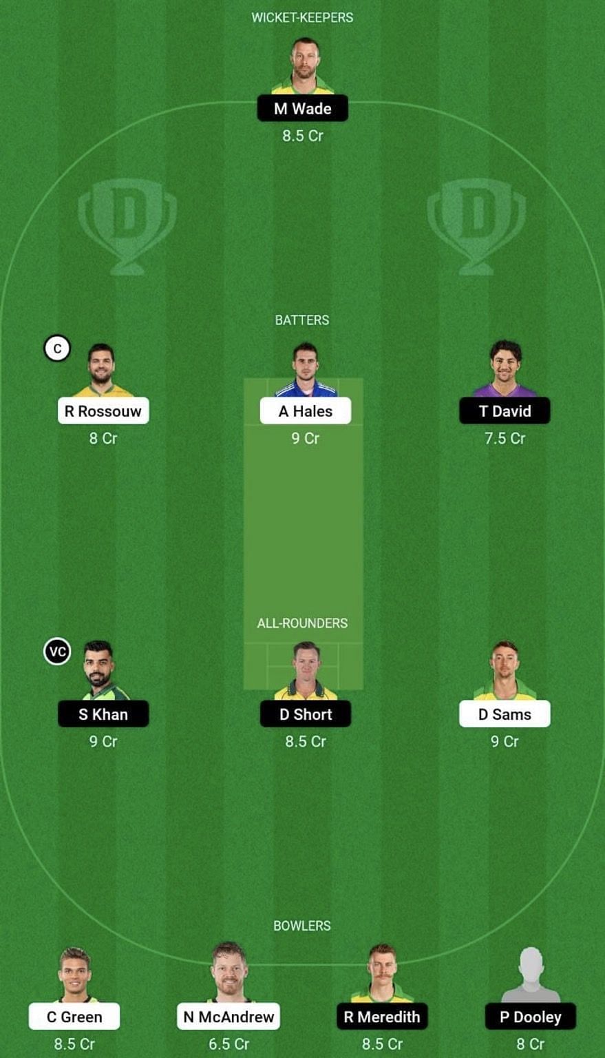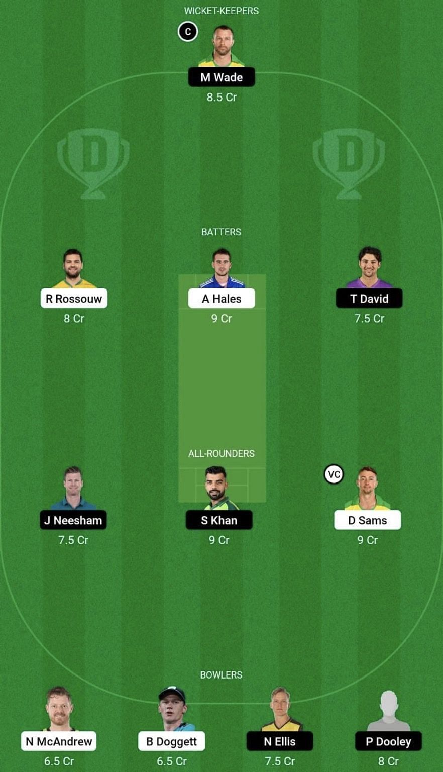 D'Arcy Short, James Neesham, Matthew Wade (c&wk), Shadab Khan, Tim David, Asif Ali, Caleb Jewell, Nathan Ellis, Joel Paris, Patrick Dooley and Riley Meredith.