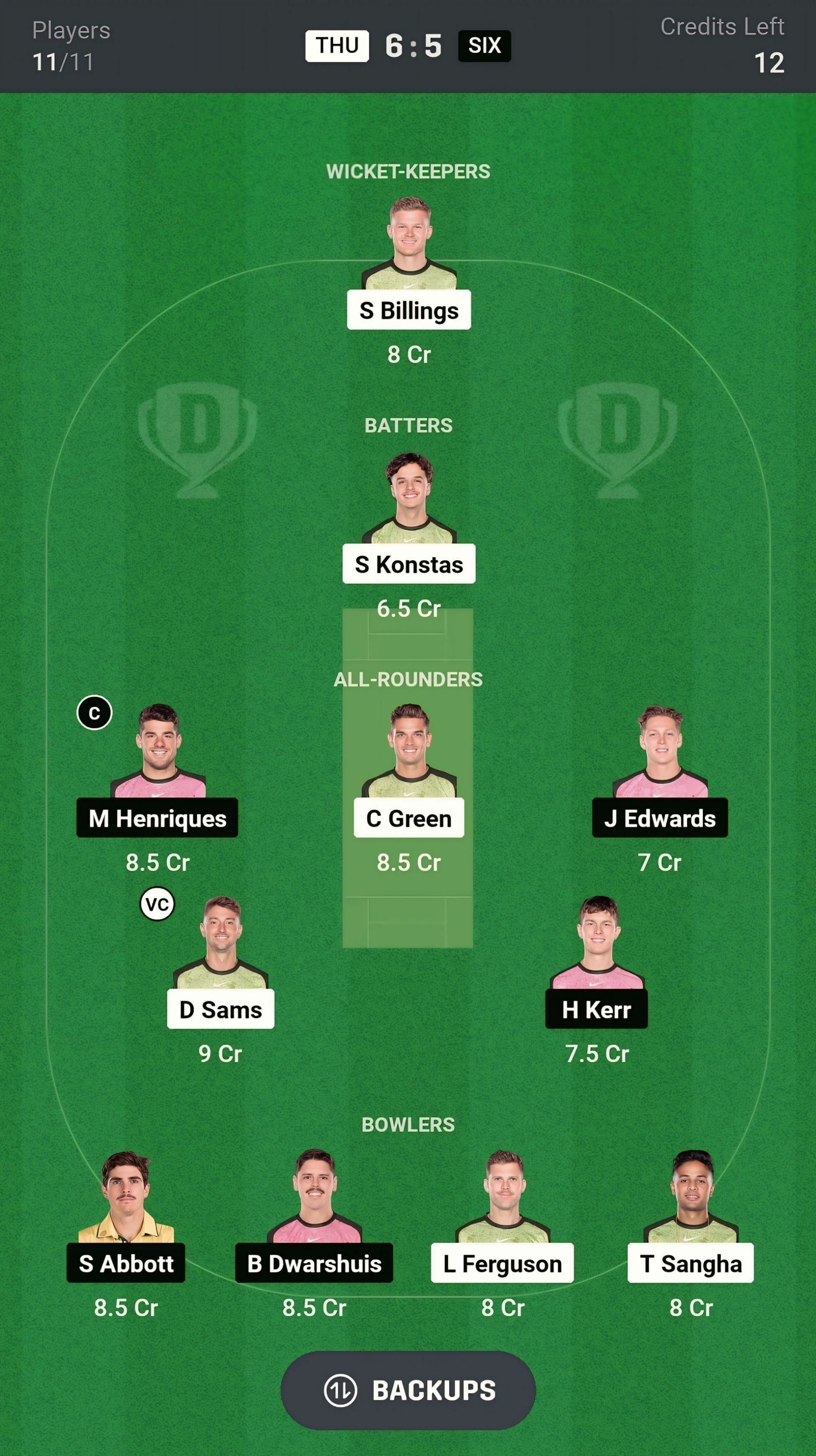 THU vs SIX match captain and vice-captain choices