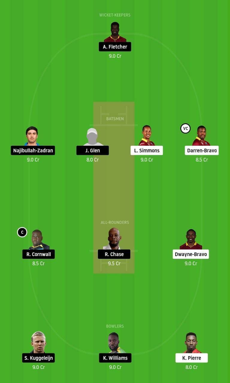 Fantasy Suggestion #1: Andre Fletcher, Lendl Simmons, Darren Bravo, Najibullah Zadran, Javelle Glen, Roston Chase, Rakheem Cornwall, Dwayne Bravo, Scott Kuggeleijn, Kesrick Williams and Khary Pierre