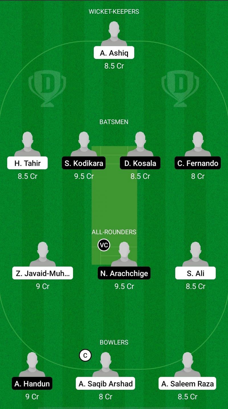Fantasy Suggestion #1: Awais Ashiq, Salinda Kodikara, Damith Kosala, Hassan Tahir, Cresley Fernando, Nuwan Sameera Arachchige, Zeeshan Muhammad, Sadaqat Ali, Akash Handun, Atif Saleem Raza, Ali Saqib Arshad.
