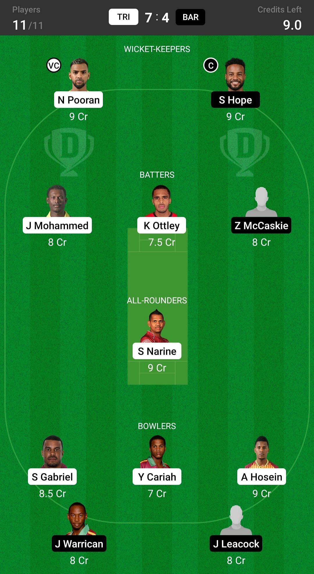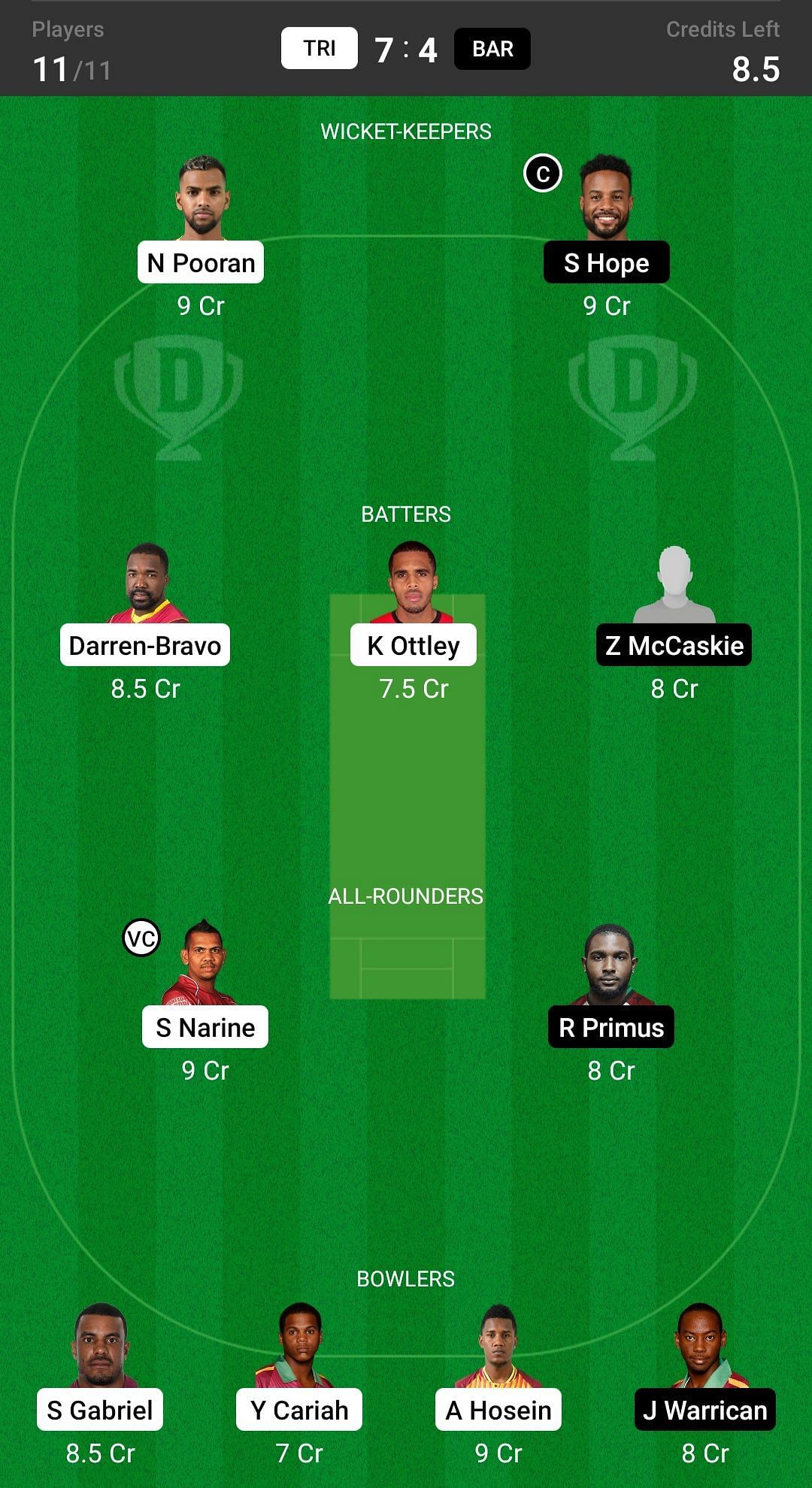 S Narine and R Primus are the best all-rounder picks for the Dream11 team as they are batting in the top order and also completing their quota of overs. N Kirton is another good pick for today's Dream11 team.