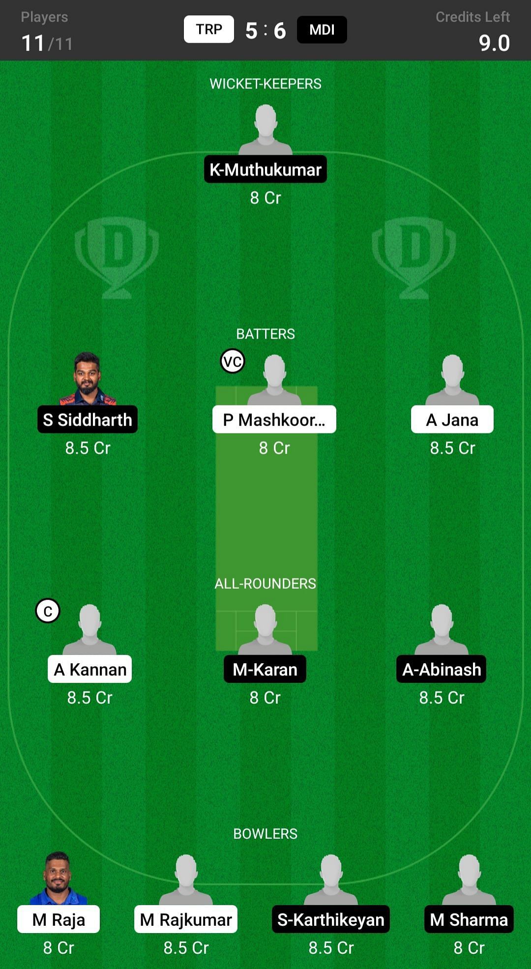 A Jana and S Siddharth are the two best batter picks for the Dream11 team. P Mashkoor has played exceptionally well in the last match, so he is also a good pick for today's Dream11 team.