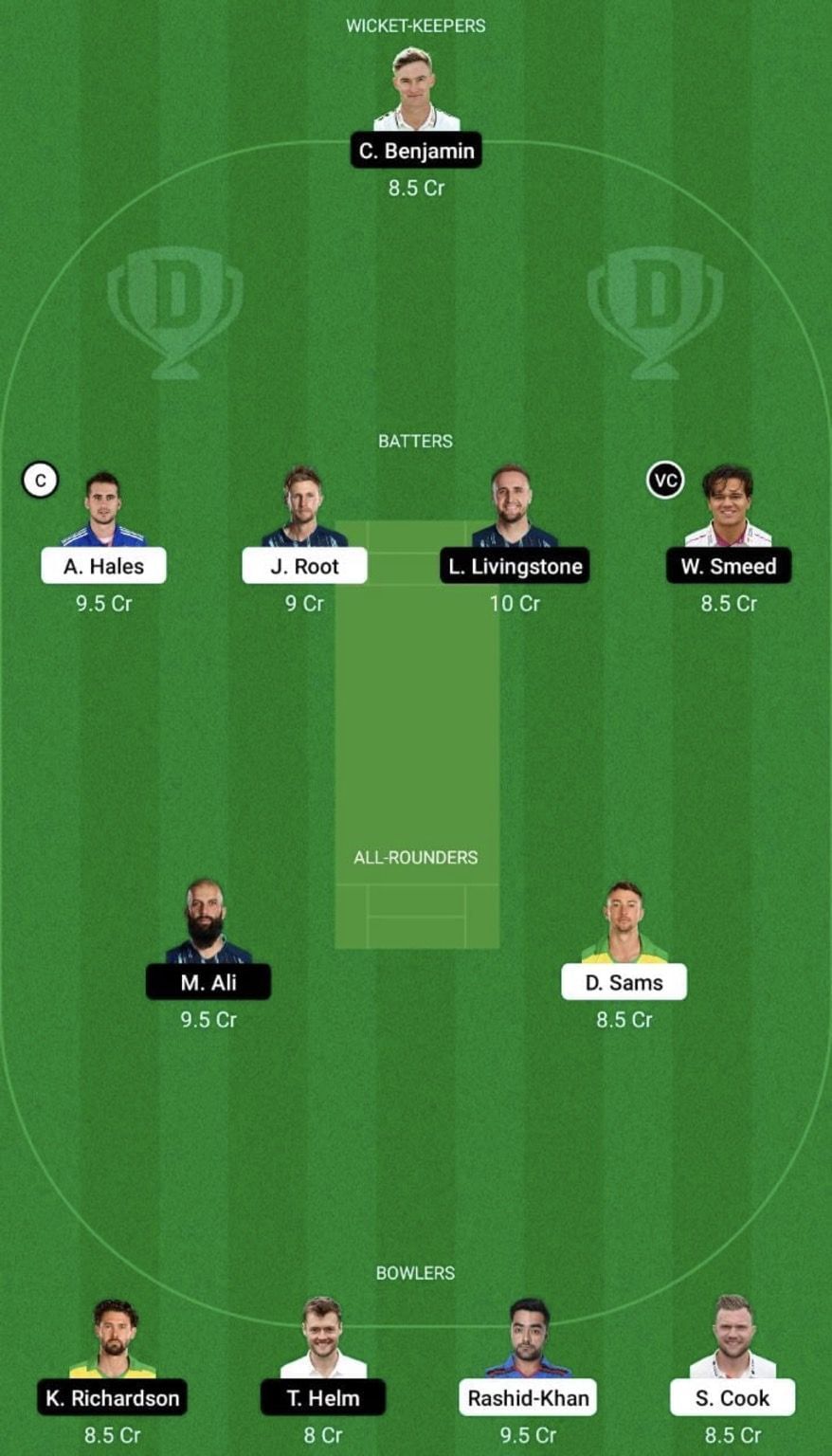 Fantasy Suggestion #1: Chris Benjamin, Alex Hales, Joe Root, Liam Livingstone, Will Smeed, Moeen Ali, Daniel Sams, Kane Richardson, Tom Helm, Rashid Khan and Samuel Cook.