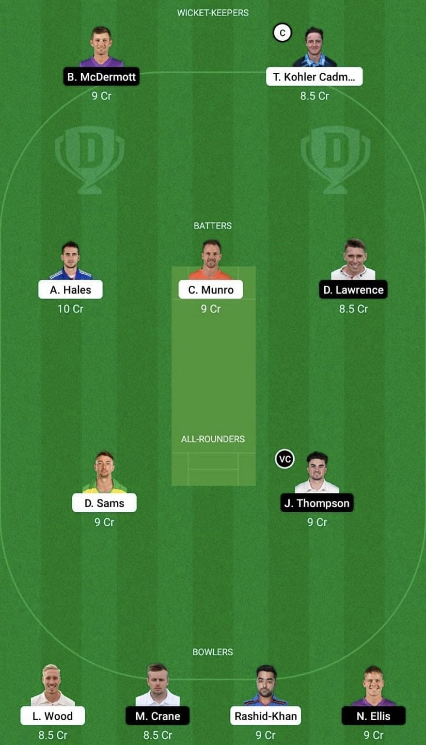 Wicketkeeper: Ben McDermott, Tom Kohler-Cadmore (c)