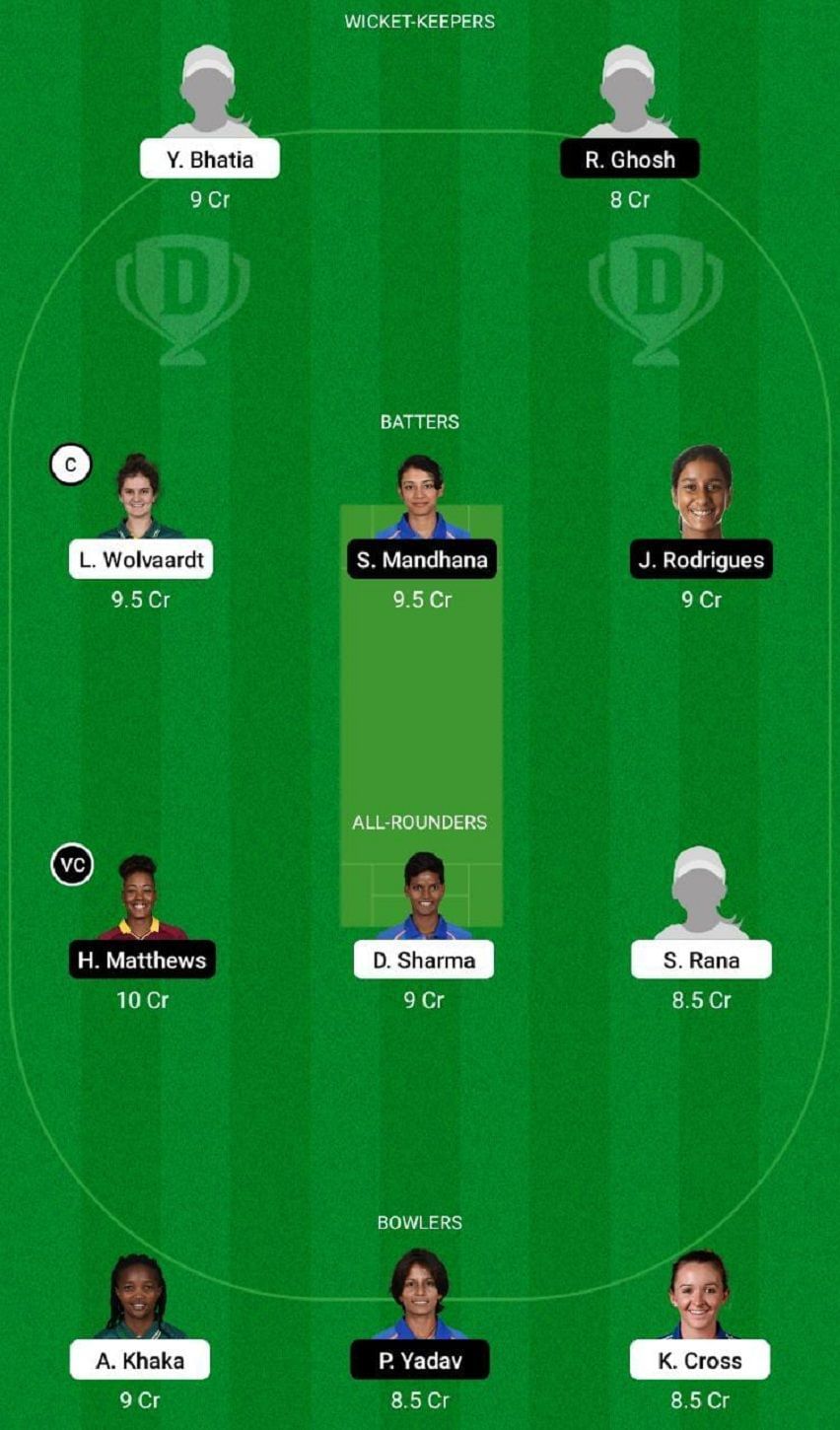 Fantasy Suggestion #1: Y Bhatia, R Ghosh, L Wolvaardt, S Mandhana, J Rodrigues, H Matthews, D Sharma, S Rana, A Khaka, P Yadav and K Cross.