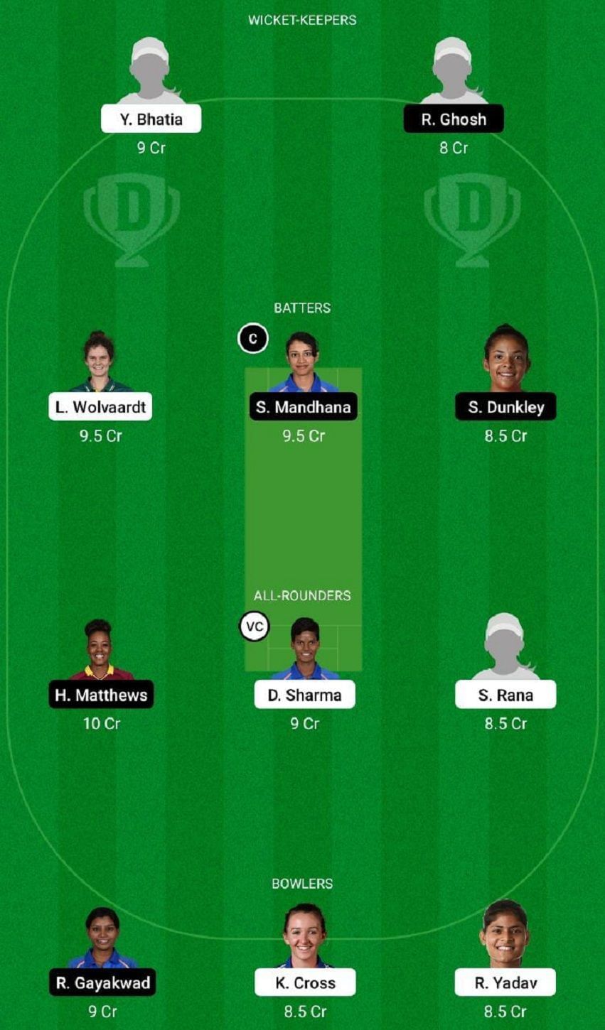Fantasy Suggestion #2: Y Bhatia, R Ghosh, L Wolvaardt, S Mandhana, S Dunkley, H Matthews, D Sharma, S Rana, R Yadav, R Gayakwad and K Cross.