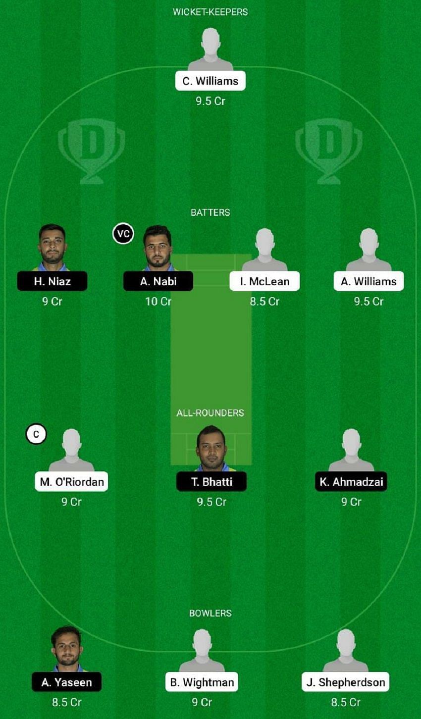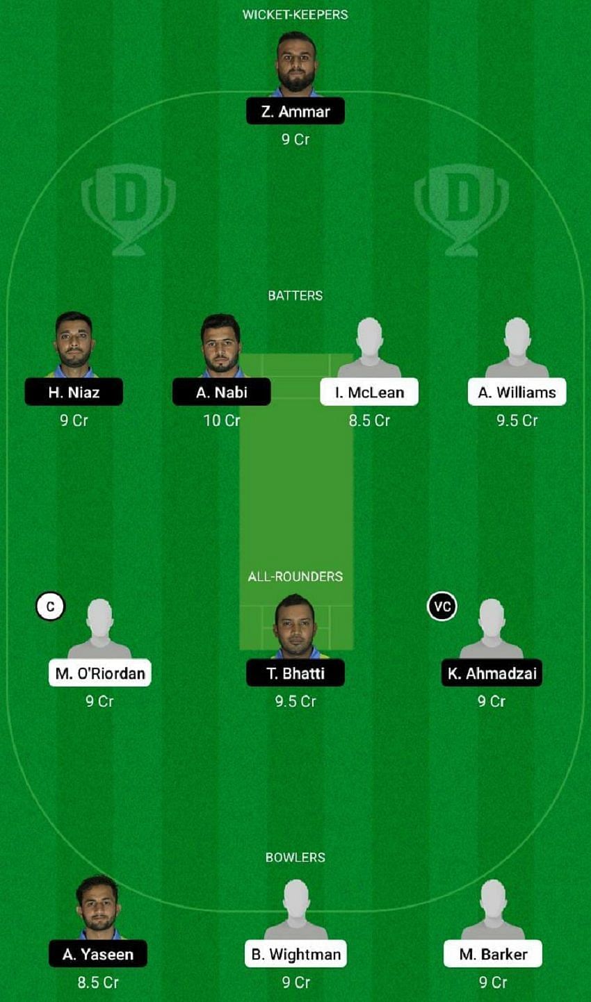 Fantasy Suggestion #2: Z Ammar, H Niaz, A Nabi, I McLean, A Williams, M O'Riordan, T Bhatti, K Ahmadzai, A Yaseen, B Wightman and M Barker