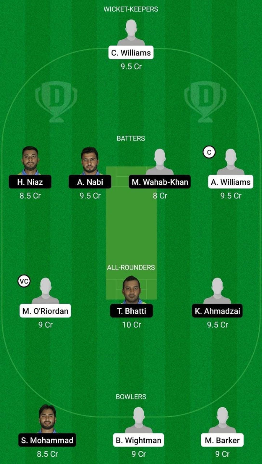 Fantasy Suggestion #1: C Williams, A Nabi, A Williams, H Niaz, M Wahab Khan, K Ahmadzai, T Bhatti, M O’Riordan, S Mohammad, B Wightman, M Barker.