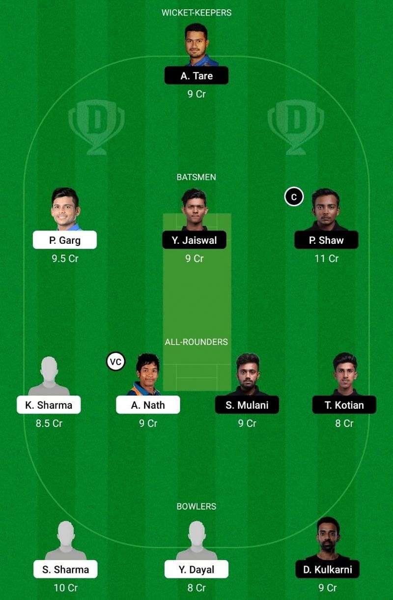 Fantasy Suggestion #1: Aditya Tare, Priyam Garg, Yashasvi Jaiswal, Prithvi Shaw, Karan Sharma, Akshdeep Nath, Shams Mulani, Tanush Kotian, Shivam Sharma, Yash Dayal, Dhawal Kulkarni.