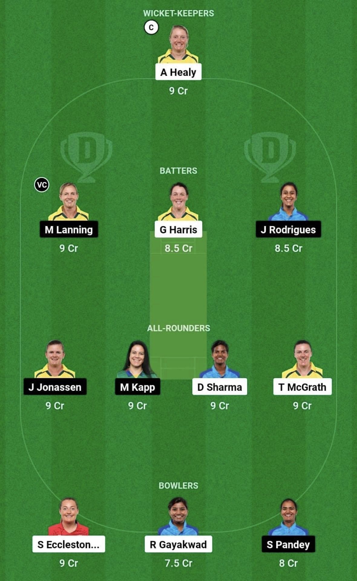 Meg Lanning (c), Shafali Verma, Marizanne Kapp, Jemimah Rodrigues, Alice Capsey, Jess Jonassen, Taniya Bhatia (wk), Arundhati Reddy, Shikha Pandey, Radha Yadav and Poonam Yadav.
