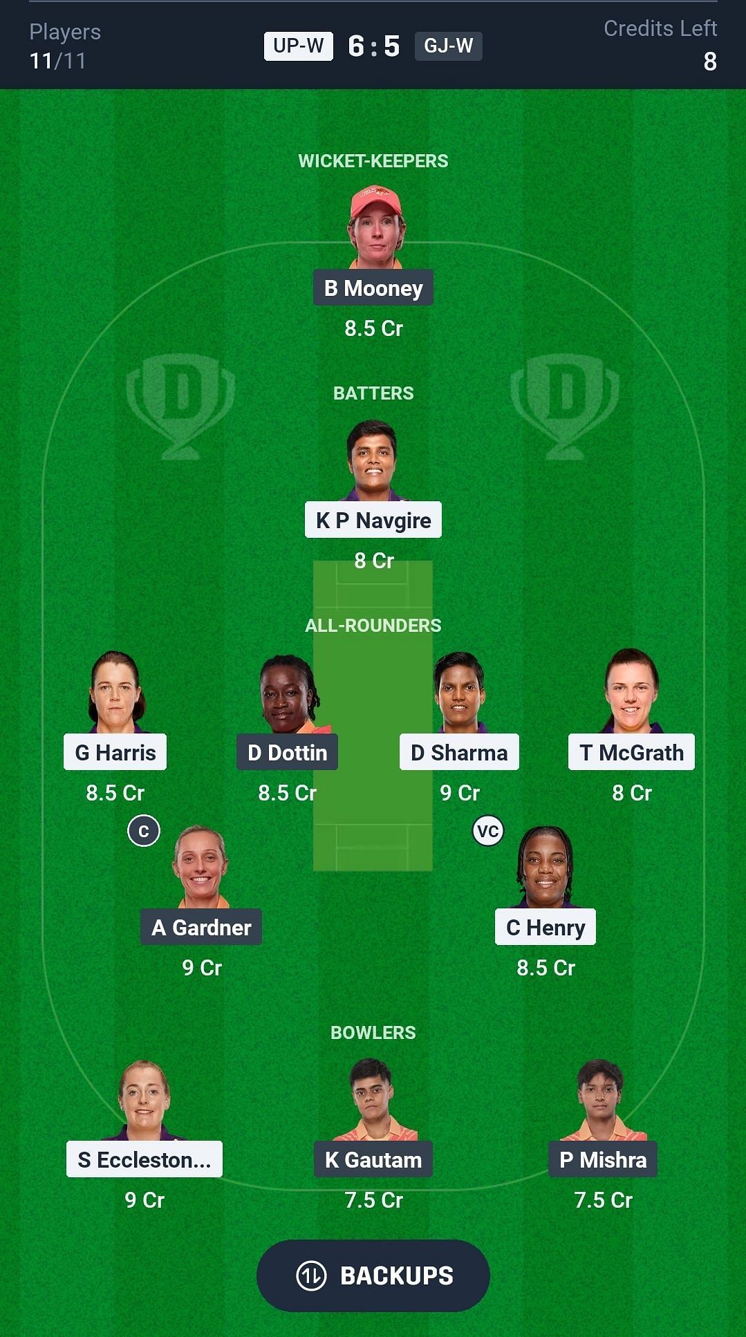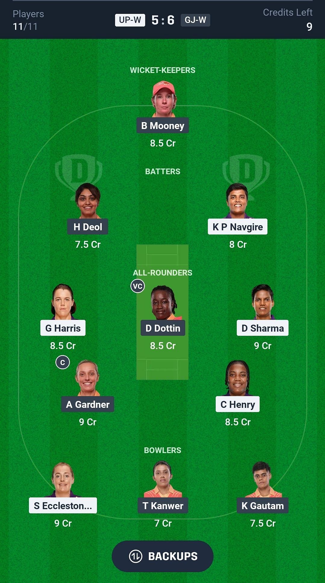 Beth Mooney (wk), Harleen Deol, Phoebe Litchfield, Ashleigh Gardner ©, Kashvee Gautam, Deandra Dottin, Tanuja Kanwer, Bharti Fulmali, Dayalan Hemalatha, Meghna Singh, and Priya Mishra.