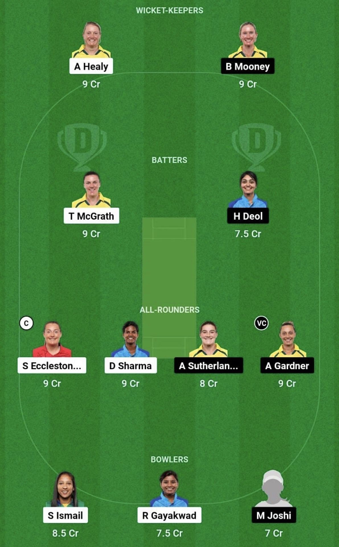 Beth Mooney/Sophia Dunkley, Sabbhineni Meghana, Ashleigh Gardner, Harleen Deol, Dayalan Hemalatha, Georgia Wareham, Sneh Rana, Annabel Sutherland, Tanuja Kanwar, Mansi Joshi, and Parunika Sisodiya.