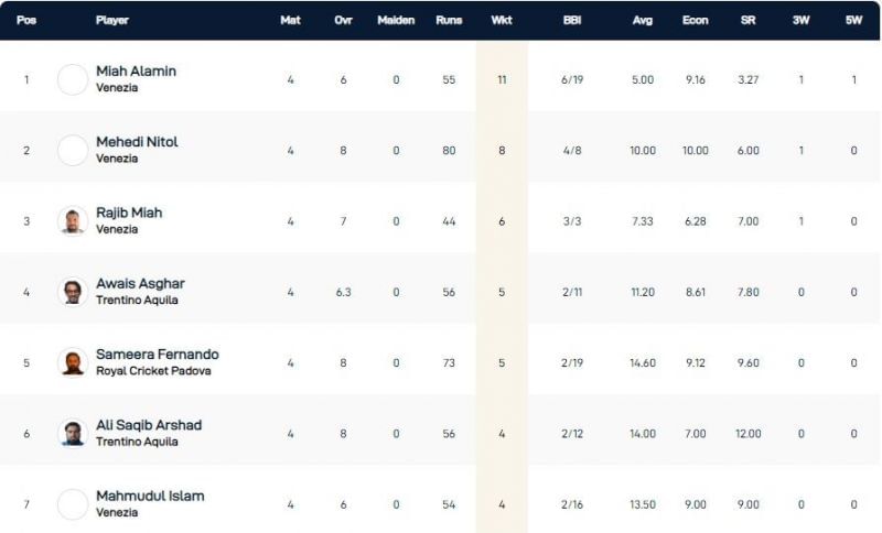 Mehedi Nitol of Venezia, with eight scalps, has slipped to second spot on the wicket-taking charts. He has a best effort of 4/8 but has been even more expensive, having taken for an average of 10.00 runs per over.