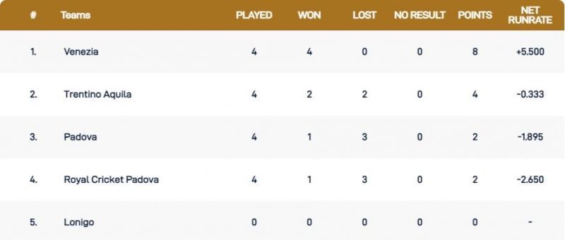 Venezia are perched atop the Venice T10 League 2021 points table. They have won all four of their matches and have eight points in their kitty.
