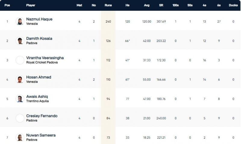 Damith Kosala of Padova is placed second on the run-scoring charts. He has smashed 126 runs thus far, with an unbeaten 66 being his highest score. Kosala's runs have come at an excellent strike rate of 203.22, and are studded with 12 fours and nine maximums.