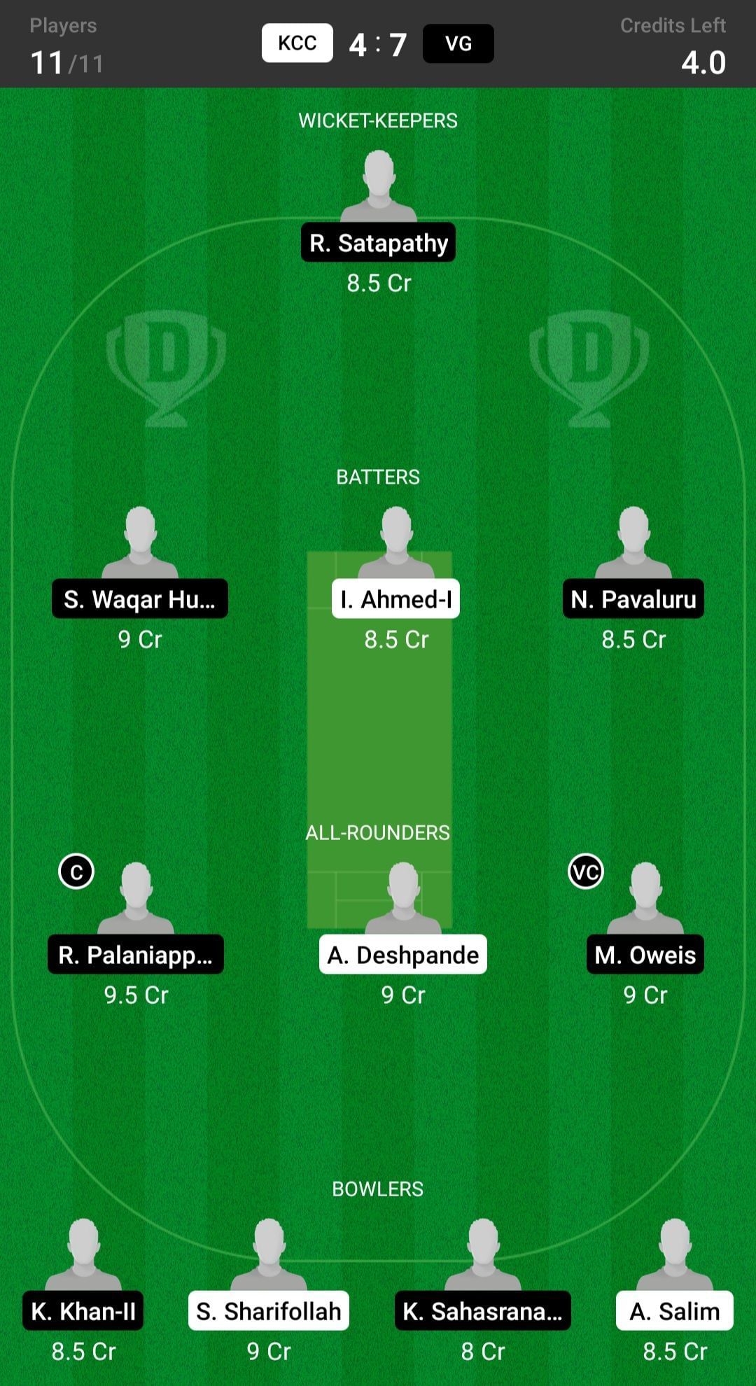 VG vs KCC match captain and vice-captain choices