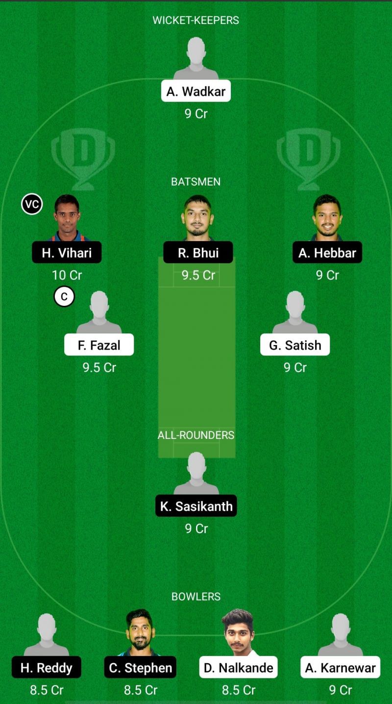Fantasy Suggestion #1: Akshay Wadkar, Faiz Fazal, Ganesh Satish, Hanuma Vihari, Ashwin Hebbar, Ricky Bhui, KV Sasikanth, Cheepurapalli Stephen, Harishankar Reddy, Akshay Karnewar, Darshan Nalkande.