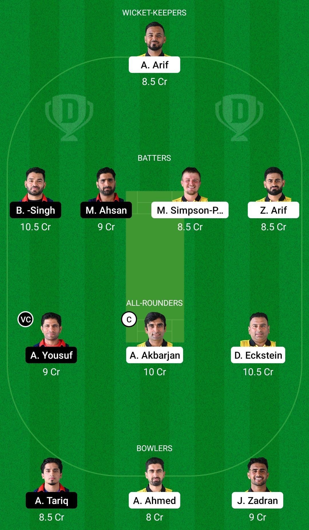 Fantasy Suggestion #1: Arsalan Arif, Balwinder Singh, Imran Asif, Mark Simpson-Parker, Ahsan Yousuf, Umair Tariq, Abdullah Akbarjan, Daniel Eckstein, Adeel Tariq, Abdollah Ahmed, Jaweed Zadran