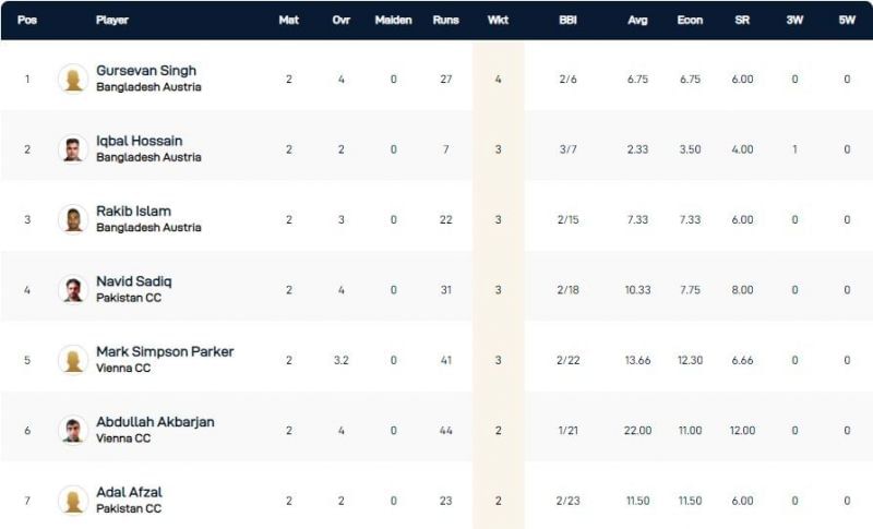 Gursevan Singh of Bangladesh Austria, with four scalps, emerged as the highest wicket-taker on Day 1 of the Vienna T10 League 2021. He has a best spell of 2/6 and a decent economy rate of 6.75.