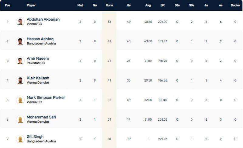 Hassan Ashfaq of Bangladesh Austria occupies second position on the run-scoring charts. He amassed 43 runs in the only knock he played on Monday. Ashfaq's runs have come at a decent strike rate of 153.57, and are studded with a couple of fours and sixes each.