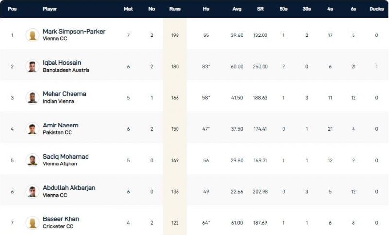 Mark Simpson-Parker of Vienna CC has emerged as the highest run-scorer after the fifth day of action in the Vienna T10 League 2021. He has aggregated 198 runs in seven matches, with 55 being his best effort. Simpson-Parker has scored his runs at a decent strike rate of 132.00, with the help of 17 fours and five sixes.