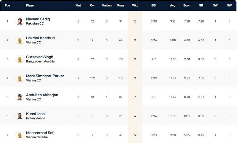 Lakmal Kasthuri of Vienna CC and Gursevan Singh of Bangladesh Austria are among three bowlers who have taken nine apiece in the Vienna T10 League 2021 to date. They are placed second and third on the wicket-taking charts based on their economy rates.