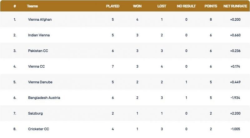 Indian Vienna, Pakistan CC and Vienna CC follow the table-toppers in the standings, with six points apiece. They are placed in that order based on their net run rates.