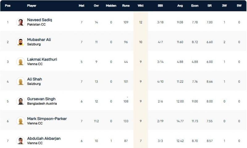 Apart from Kasthuri, Vienna CC's Mark Simpson-Parker (9) and Abdullah Akbarjan (7), Bangladesh Austria's Gursevan Singh (9) and Iqbal Hossain (5), Vienna Danube's Mohammad Safi (6) and Soleimankhel Habibullah (5), and Cricketer CC's Baseer Khan (6) and Mohammad Waqar Zalmai (5) are the highest wicket-takers from their respective teams.