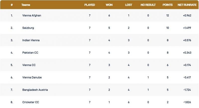 Salzburg, with ten points to their name, occupy second spot in the standings. They registered wins in both their matches on Monday to leapfrog Indian Vienna and Pakistan CC in the points table.