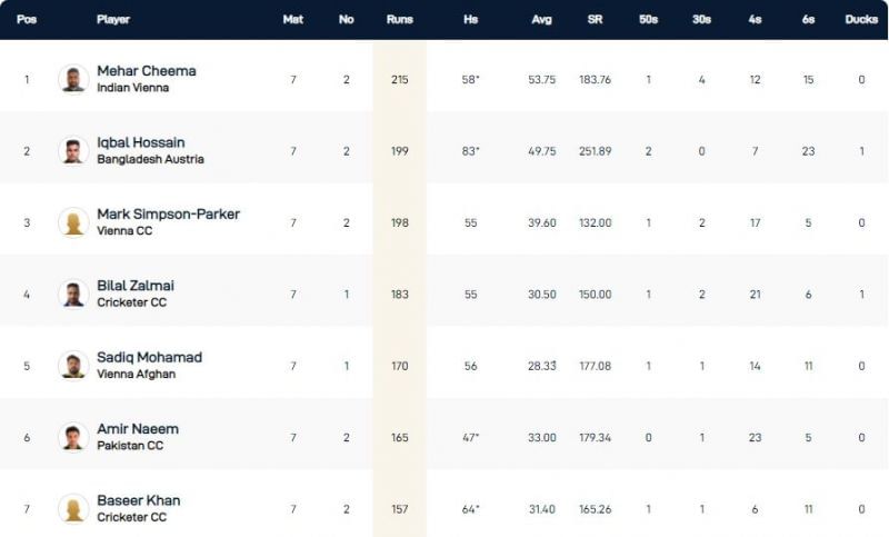 Mehar Cheema of Indian Vienna continues to be the highest run-scorer after the seventh day of action in the Vienna T10 League 2021. He has smashed 215 runs in six knocks, with an unbeaten 58 being his best effort. Cheema has an impressive strike rate of 183.76, and has struck 12 fours and 15 sixes.