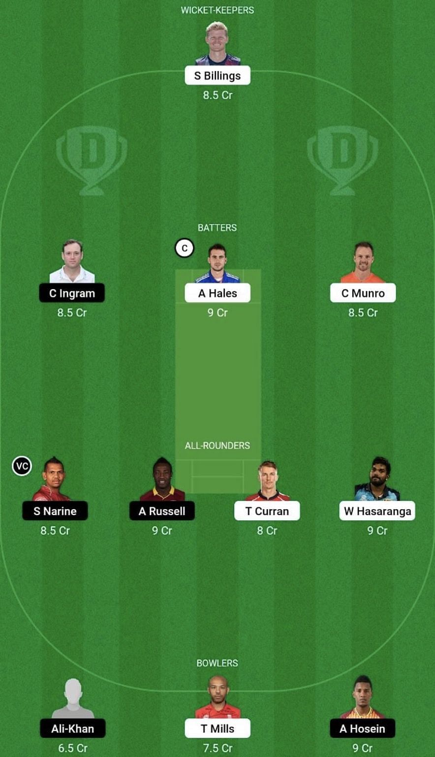 Rohan Mustafa, Alex Hales, Colin Munro (c), Sam Billings (wk), Sherfane Rutherford, Benny Howell, Tom Curran, Sheldon Cottrell, Tymal Mills, Ali Naseer and Gus Atkinson/Wanindu Hasaranga.