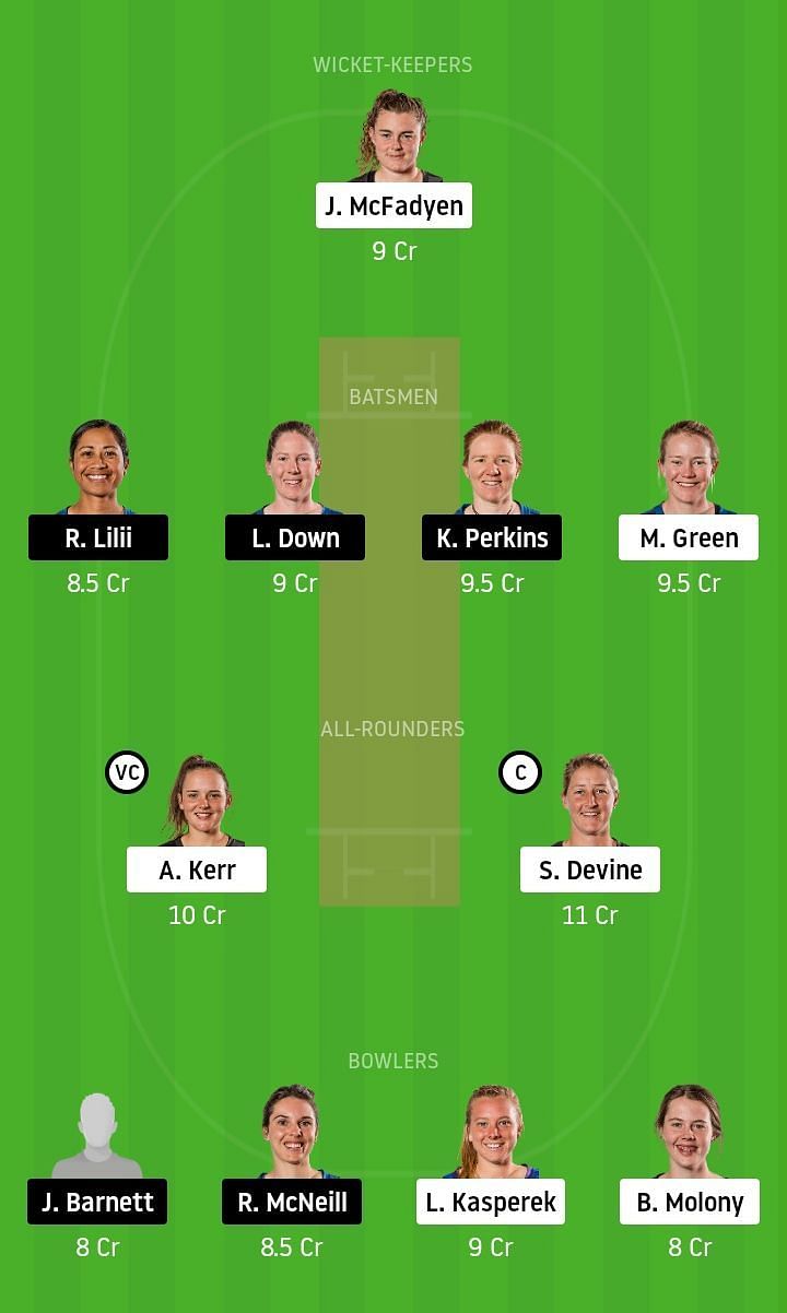 Fantasy Suggestion 1: Sarah Carnachan, Maddy Green, Kate Perkins, Lauren Down, Rebecca Burns, Sophie Devine, Amelia Kerr, Leigh Kasperek, Bethany Molony, Jess Kerr and Anna Peterson.