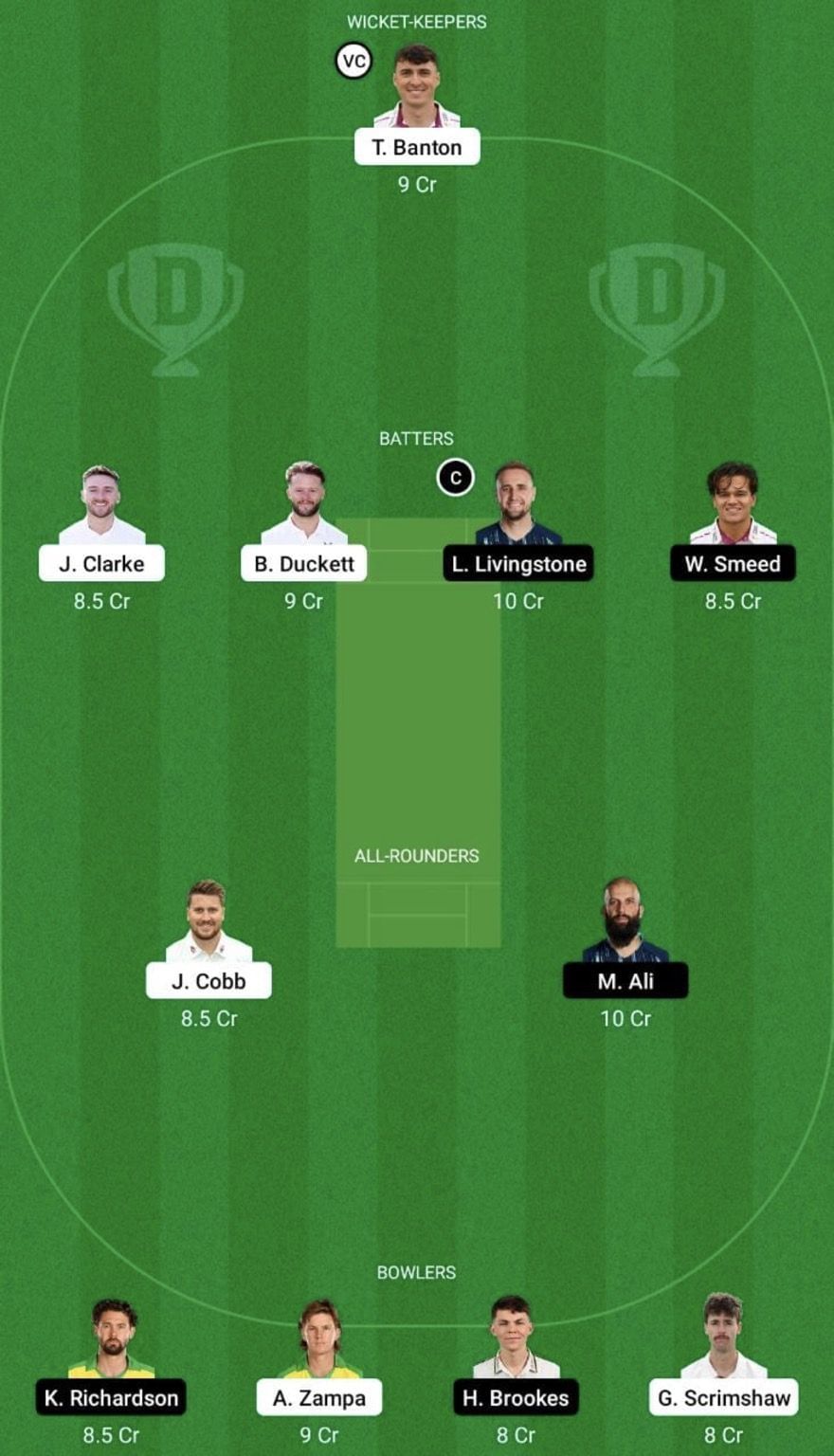 Fantasy Suggestion #1: Tom Banton, Joe Clarke, Ben Duckett, Liam Livingstone, Will Smeed, Joshua Cobb, Moeen Ali, Kane Richardson, Adam Zampa, Henry Brookes and George Scrimshaw.