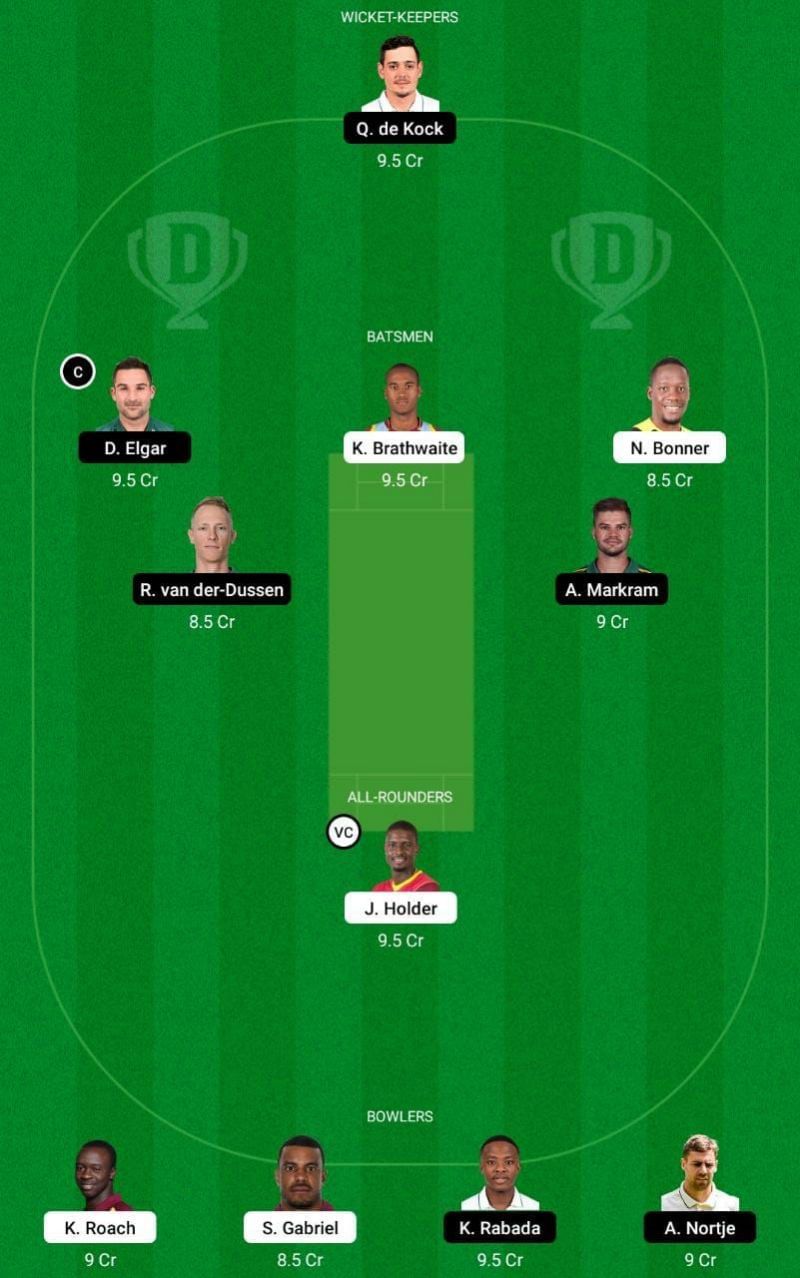 Fantasy Suggestion #1: Quinton de Kock, Aiden Markram, Dean Elgar, Kraigg Brathwaite, Nkrumah Bonner, Rassie van der Dussen, Jason Holder, Anrich Nortje, Kagiso Rabada, Kemar Roach and Shannon Gabriel