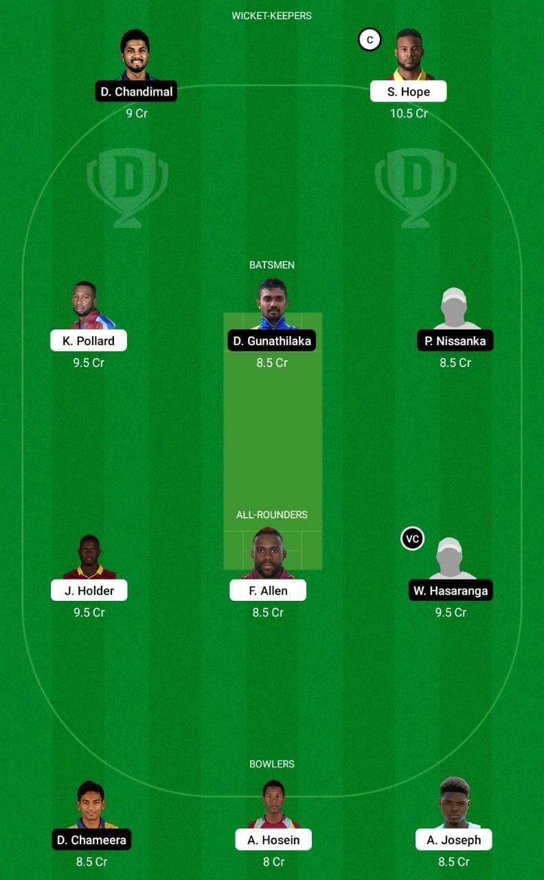 Fantasy Suggestion #1: Shai Hope, Dinesh Chandimal, Danushka Gunathilaka, Kieron Pollard, Pathum Nissanka, Jason Holder, Fabian Allen, Wanindu Hasaranga, Dushmantha Chameera, Alzarri Joseph and Akeal Hosein