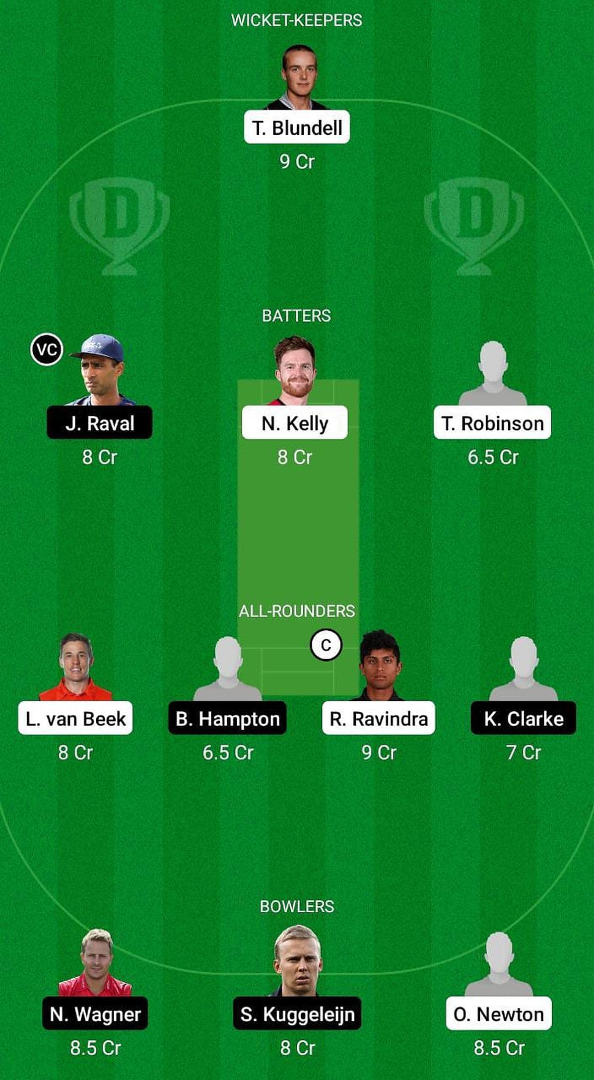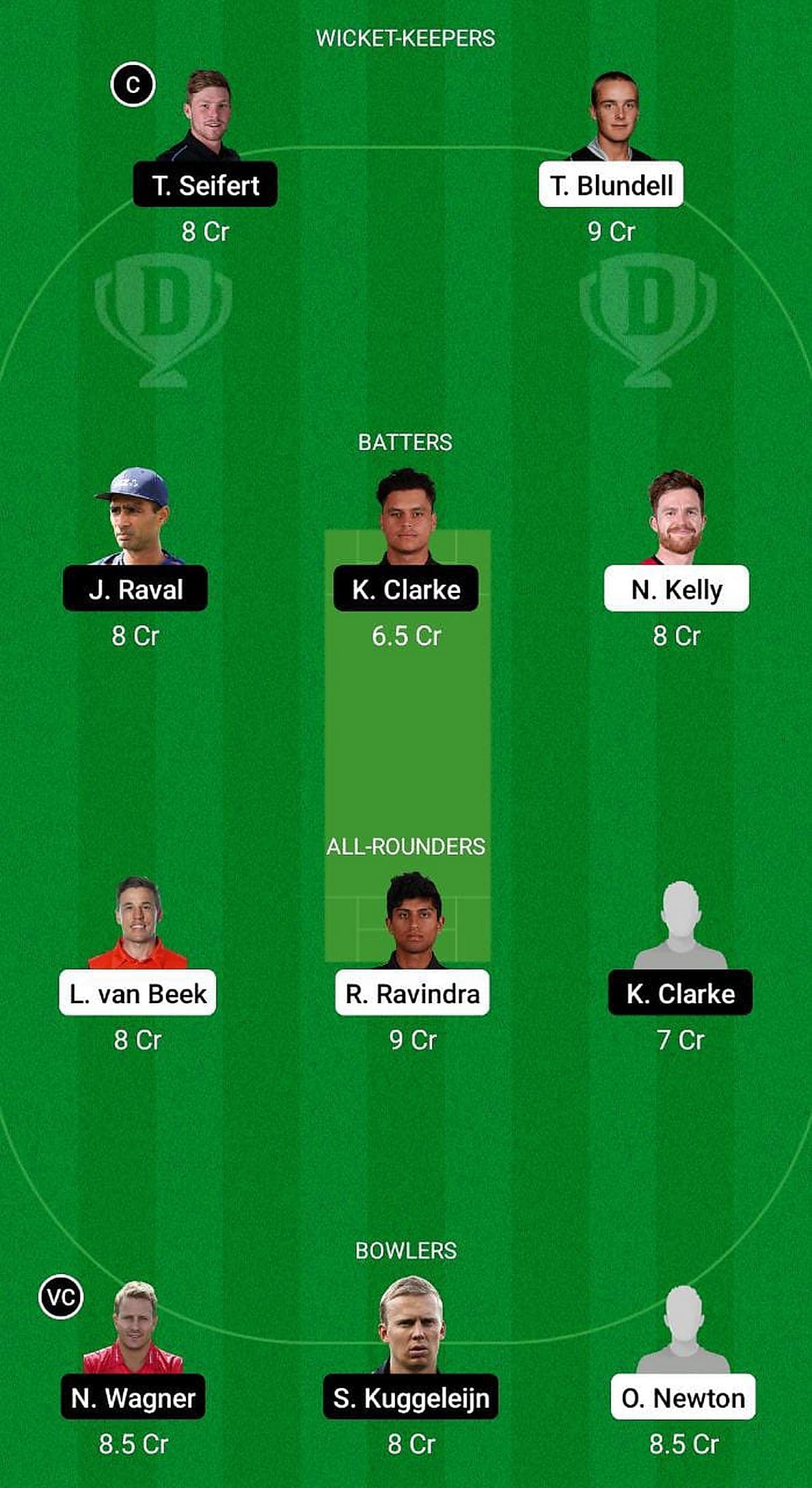 All-rounders: Logan Van Beek, Rachin Ravindra (c), K Clarke, Ben Hampton