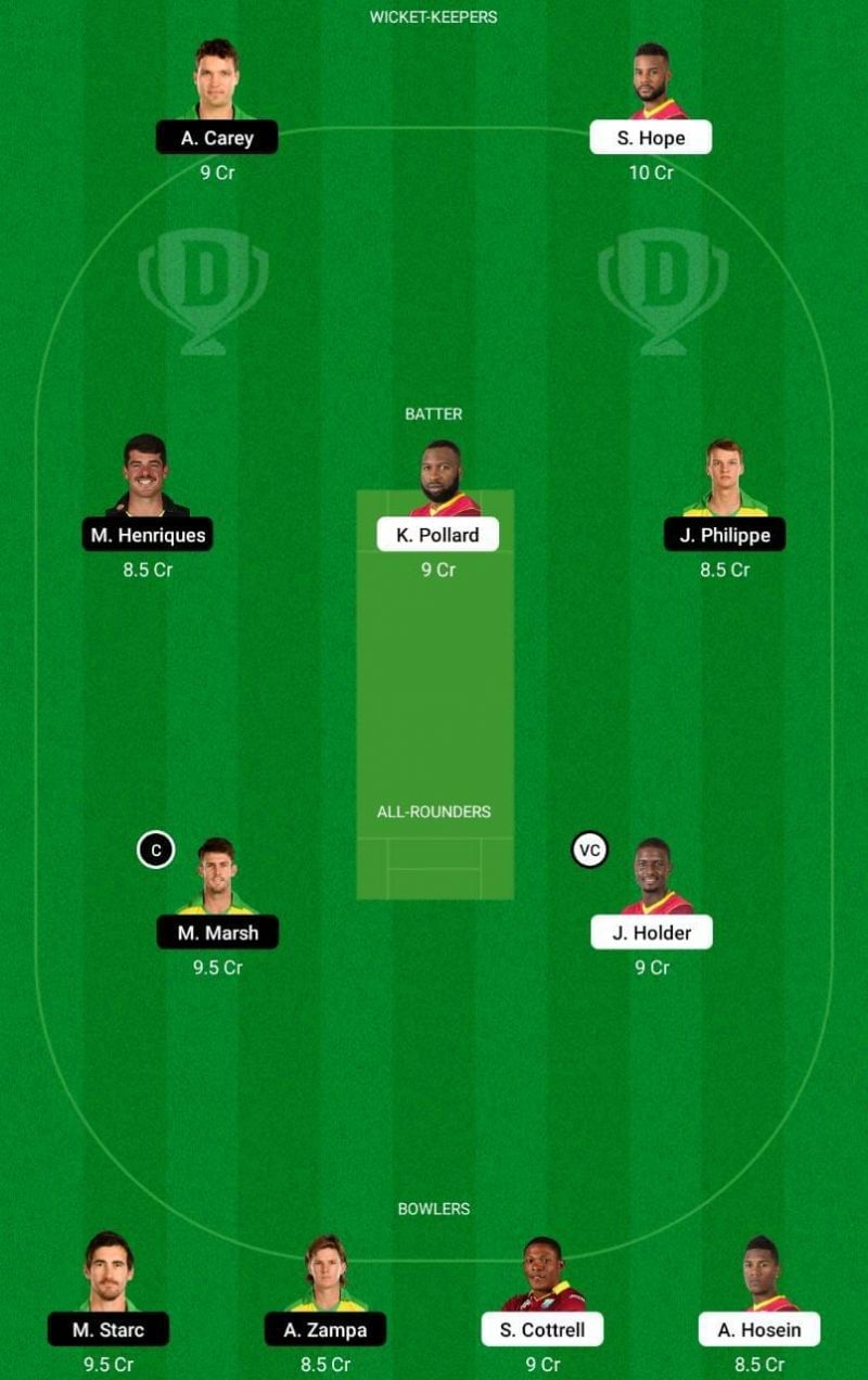 Fantasy Suggestion #1: Alex Carey, Shai Hope, Evin Lewis, Moises Henriques, Darren Bravo, Jason Holder, Mitchell Marsh, Mitchell Starc, Akeal Hosein, Alzarri Joseph and Adam Zampa
