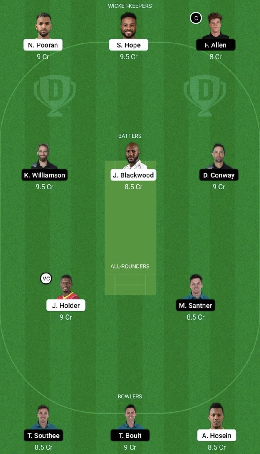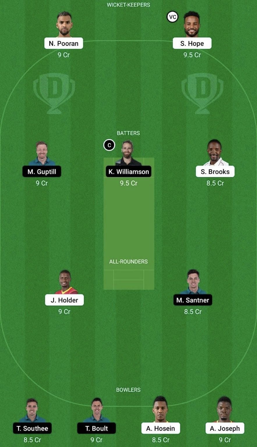 Fantasy Suggestion #1: Nicholas Pooran, Shai Hope, Martin Guptill, Kane Williamson, Shamarh Brooks, Jason Holder, Mitchell Santner, Tim Southee, Trent Boult, Akeal Hosein and Alzarri Joseph.