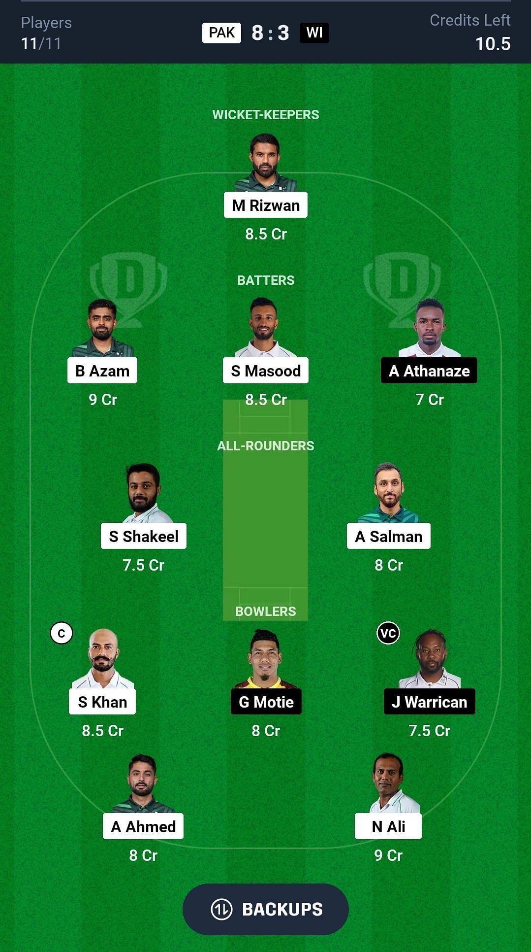 Shan Masood and Babar Azam are the two best batsmen picks for today's Dream11 team. Masood is in top-notch form. He smashed 63 runs in the last test match. Alick Athanaze is another good batter for today's match. He has already smashed 3429 runs in 61 test matches.