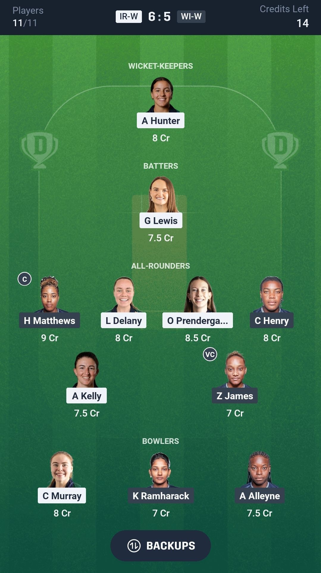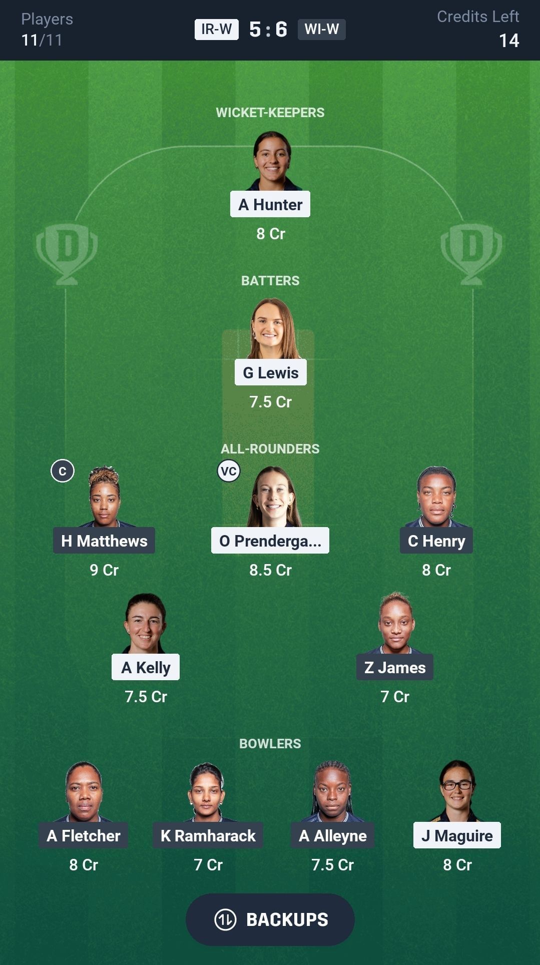 O Prendergast and H Matthews are the best all-rounder picks for the Dream11 team. Both will play a crucial role for their teams in today's match. H Matthews will open the innings for her team and complete her quota of overs. She played a crucial knock of 114 runs and even took four wickets in the last match. Z James is another good all-rounder for today's match.