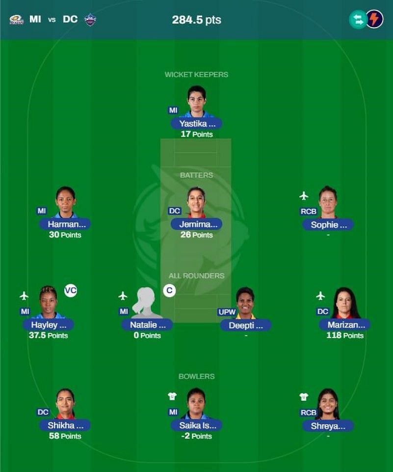 Players playing in Match 18 are: Harmanpreet Kaur (BAT) (MI) (10 Credits), Nat Sciver-Brunt (MI) (ALL) (10 Credits), Hayley Matthews (MI) (ALL) (9 Credits), Saika Ishaque (BOWL) (MI) (6 Credits), Yastika Bhatia (WK) (MI) (8 Credits), Shikha Pandey (BOWL) (DC) (8 Credits), Jemimah Rodrigues (BAT) (DC) (9 Credits), and Marizanne Kapp (ALL) (DC) (9 Credits).